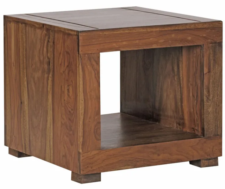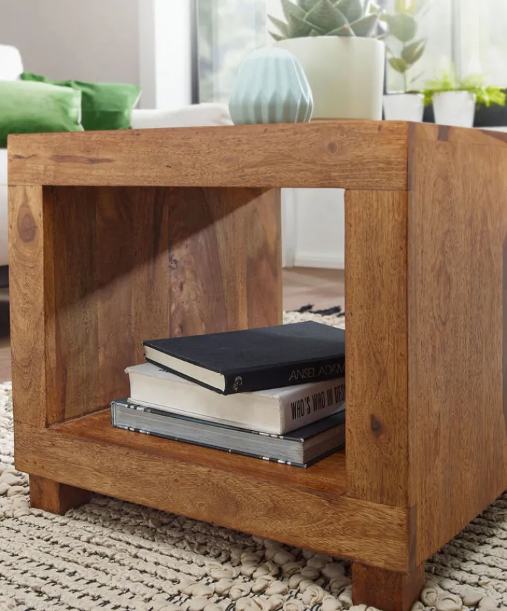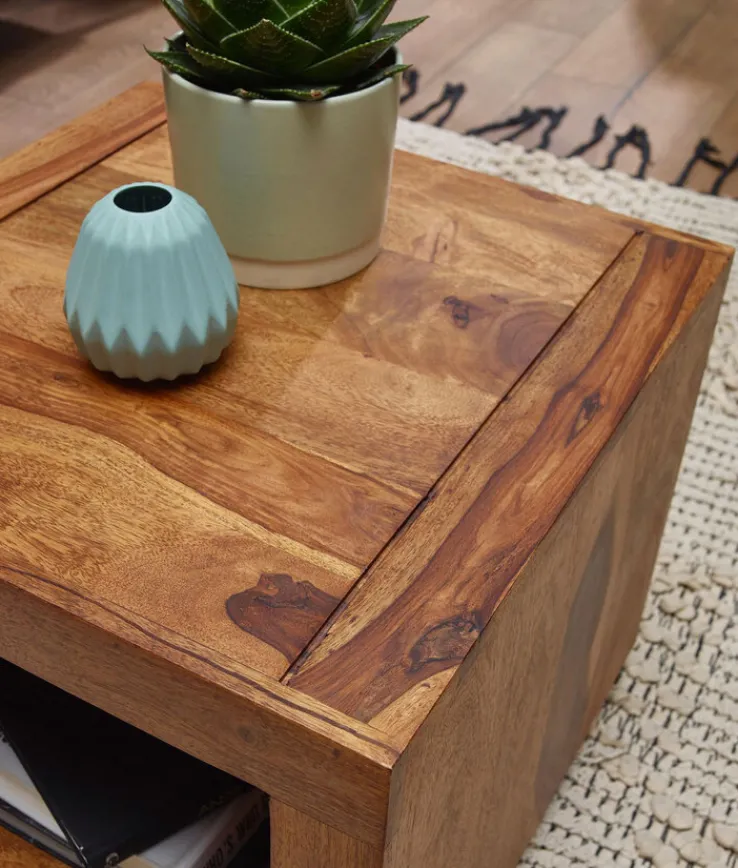 Der Couchtisch wertet Wohnzimmer, gute Stuben und alle Sitzbereiche sowie Leseecken auf. Er besteht aus feinem Sheesham, einem Massivholz. Für eine attraktive Oberfläche wurde das Material gebeizt. Das Modell ist genauso breit wie lang, aber in der Höhe genau fünf Zentimeter niedriger. Zusätzlich steht er auf kleinen Möbelfüßen, die ihm einen edlen Look verleihen. Der Couchtisch bringt ein großes offenes Fach mit, das 36 x 28 cm misst und für Bücher, Deko und Zubehör genutzt werden kann.