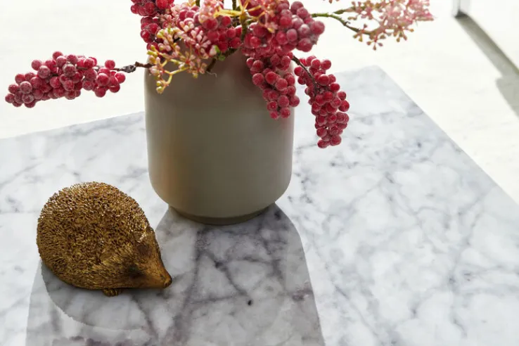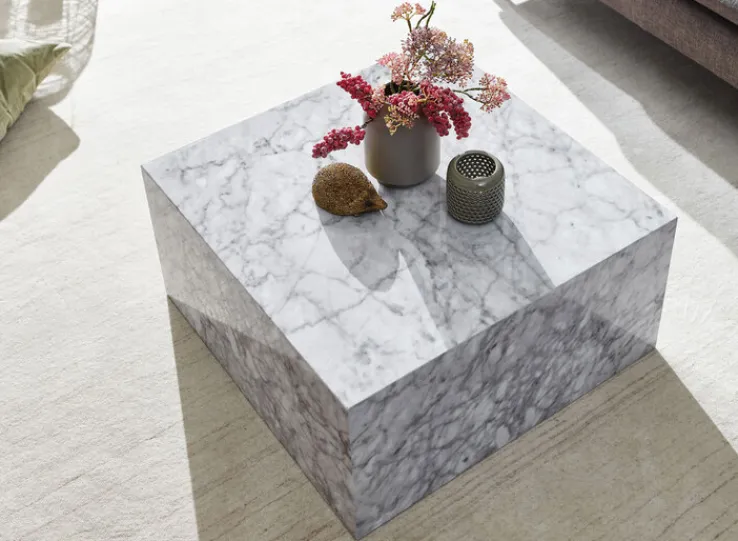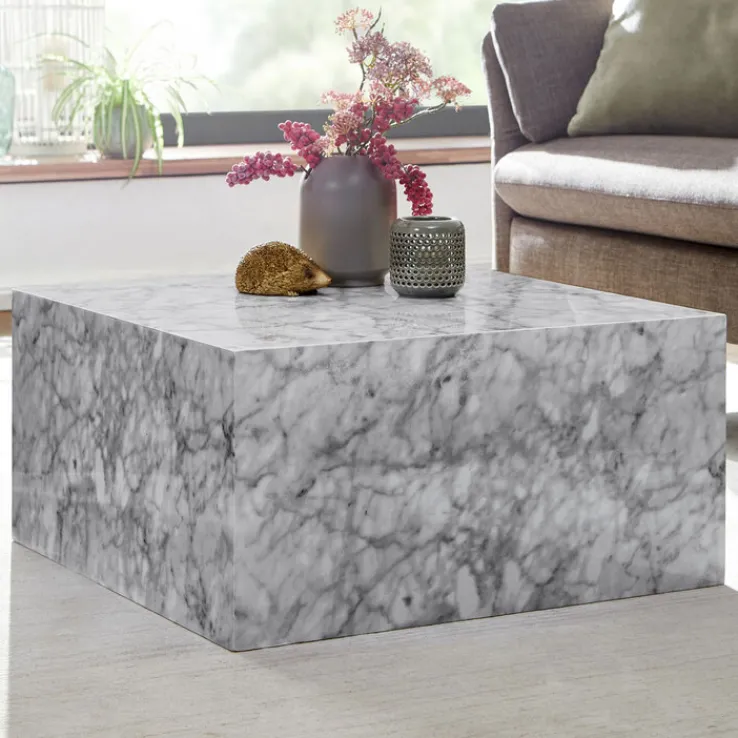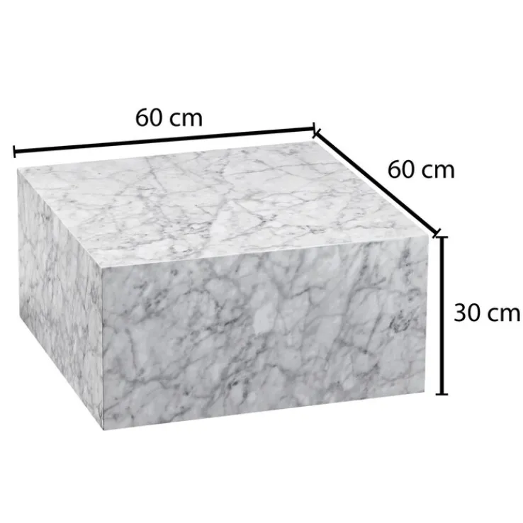 Ein Marmorblock mitten im Wohnzimmer? Genauso könnte ein Besucher zuerst fragen, der diesen individuellen Couchtisch in quadratischer Form von 60,0 x 60,0 x 30,0 cm in Marmor Optik zuerst sieht. Ein typisch grau-weißes Erscheinungsbild im quadratischen Würfeldesign verleiht dem Tisch seinen besonderen Style. Durch die Höhe von 30,0 cm kann der Couchtisch mit allen Sesseln und Sofas kombiniert werden.