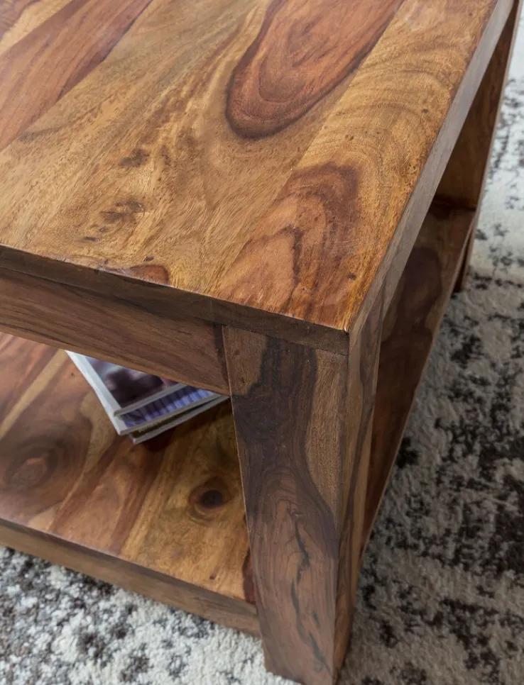 Der quadratische Couchtisch ist 60 x 60 cm groß und besteht aus braunem Sheesham-Holz. Die Oberfläche ist gebeizt, sodass die Maserung des Holzes schön zur Geltung kommt.
