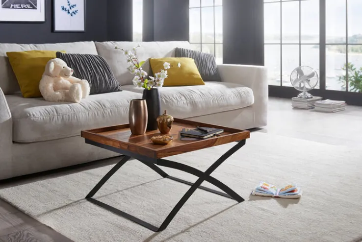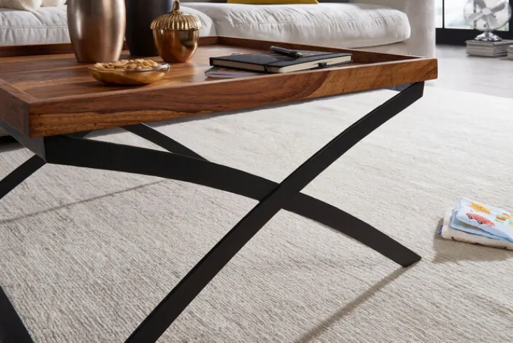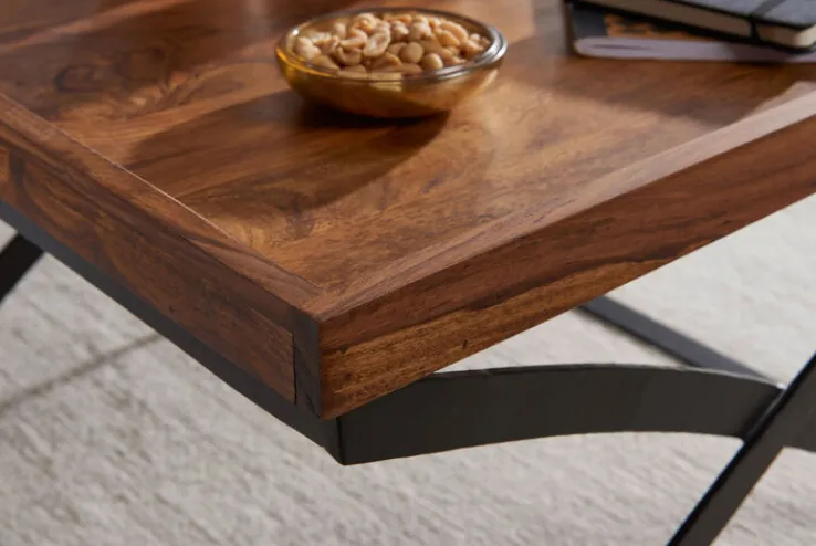 Der Couchtisch misst in Breite und Länge 63 x 63 cm. Die Tischplatte besteht aus massivem gebeizten Sheesham (Rosenholz) in Braun, das attraktiv geschwungene Kufengestell ist schwarz. Die Tischhöhe liegt bei 39 cm.