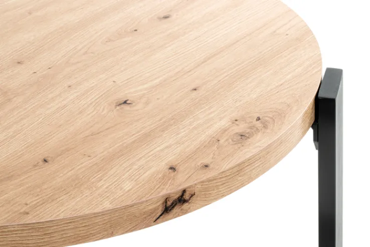 Der runde Couchtisch in den Farben Schwarz und Braun hat einen Durchmesser von 75 Zentimetern. Das rustikal im Dekor Eiche designte Modell ist 42 Zentimeter hoch und steht sicher auf einem schwarzen Vierfußgestell aus robustem Metall.