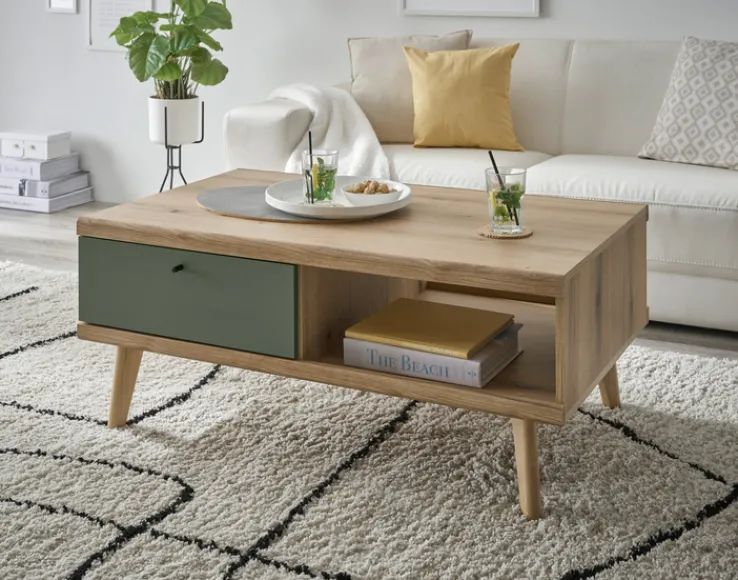 Der Couchtisch ALVA mit den Maßen 107 × 67 × 46 cm kombiniert die natürliche Optik der Evoke Eiche Nachbildung mit einem modernen Salbei-Farbton. Zwei geräumige Schubkästen und ein offenes Fach bieten praktischen Stauraum für Alltagsgegenstände. Schräg angesetzte Massivholzfüße unterstreichen das Retro-Design.