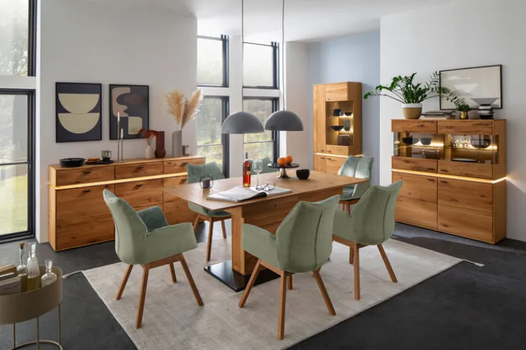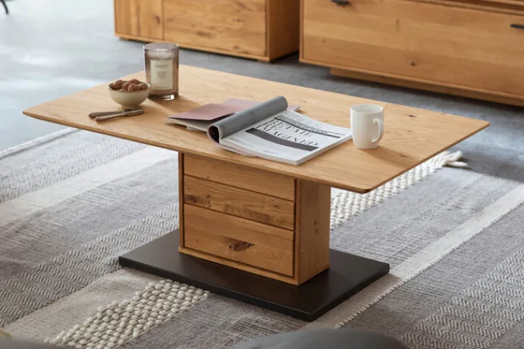 Bei diesem Tisch fällt zunächst die in Anthrazit lackierte Bodenplatte auf, die einen interessanten Kontrast zum braunen Eichenholz abgibt, dessen Oberflächenbeschichtung geölt ist. Auch, dass es sich bei der Gestellart um ein Säulengestell handelt, verleiht diesem Möbel, das eine Tiefe von 45 cm hat, einen einzigartigen Charakter. Auf der rechteckigen Tischplatte ist Platz für die Dinge, die gerade gebraucht werden, sei es die Fernsehzeitschrift für einen interessanten Filmabend oder aber die Karten beim geselligen Spieleabend mit Freunden.