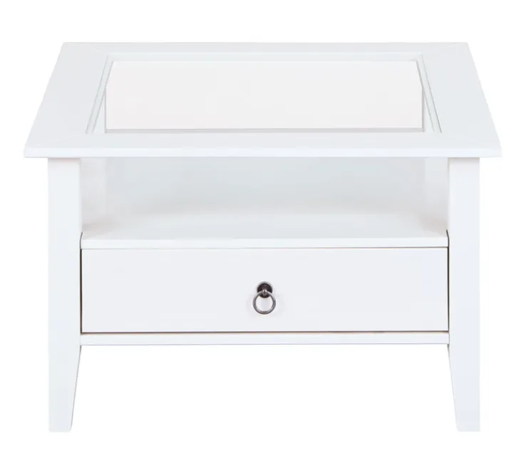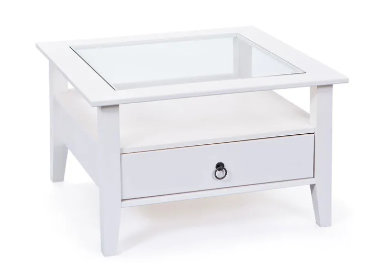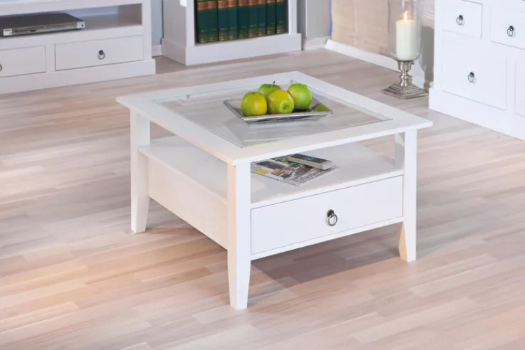 Der Couchtisch HENRY aus weiß lackiertem Kiefer Massivholz ist 75 cm breit, 45 cm hoch und 75 cm tief. Bei diesem Produkt sind Holz und Sicherheitsglas die verarbeiteten Materialien.