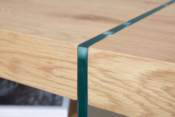 Der Couchtisch JUSTIN begeistert mit seinem modernen Design mit einem Mix aus Holz und Glas in rechteckiger Form. Das Fixgestell besteht aus transparentem Sicherheitsglas. Die Tischplatte ist in Holznachbildung aus mitteldichter Faserplatte (MDF) im hellbraunen Dekor von Wildeiche gefertigt. Der solide Tisch misst 110 cm in der Breite und 60 cm in der Tiefe bei einer Höhe von 45,5 cm. Das Gewicht liegt bei 26,6 kg.