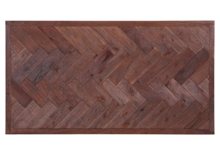 Die Tischplatte aus Holz besticht durch eine elegante Fischgrät-Optik in einem warmen Braunton, der dem Raum eine gemütliche Atmosphäre verleiht. D