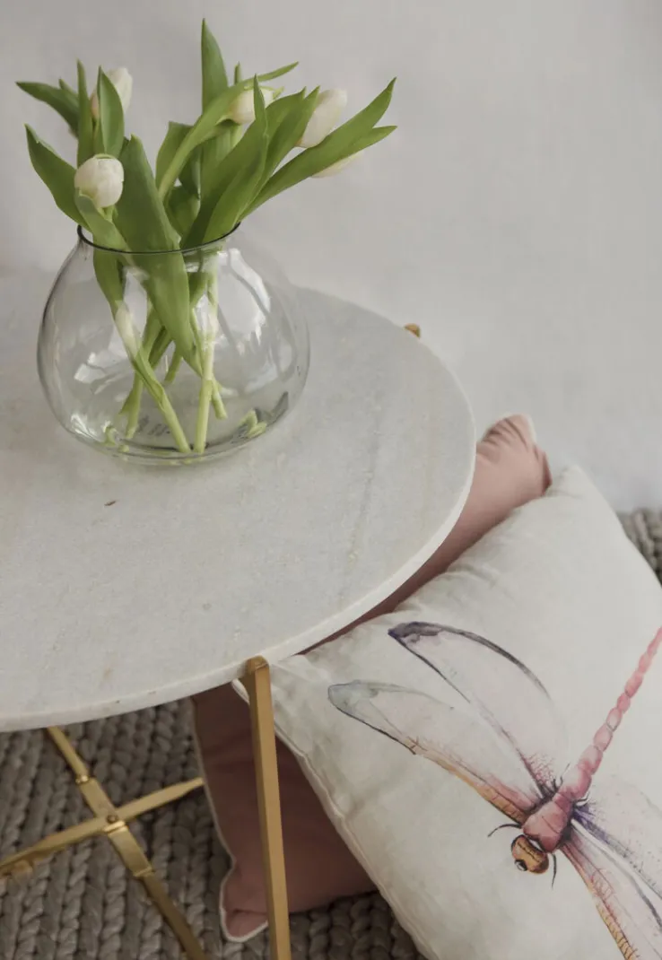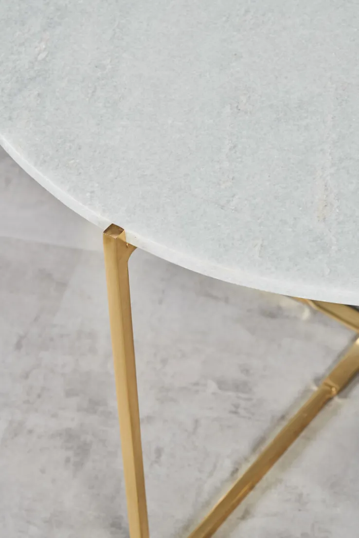 Dieser Tisch besteht aus einem goldfarbig lackierten Eisen-Kreuzgestell in Hochglanzoptik sowie einer weiß lackierten Tischplatte aus Marmor. Er ist ideal für das Wohnzimmer geeignet, wo er als Ablagefläche für die TV-Zeitschrift genauso dient wie für Gläser oder Schälchen, die mit Snacks gefüllt sind. Darüber hinaus lässt er sich aber ebenso im Gästezimmer als Nachttisch einsetzen. Dass es sich hierbei um ein hochwertiges Möbel handelt, zeigt sich nicht nur am Material, sondern auch daran, dass es 21 kg wiegt.