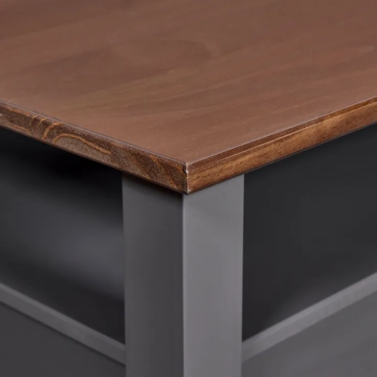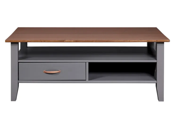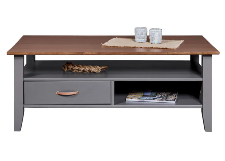 Der Couchtisch NICLAS ist aus massivem Kieferholz gefertigt. Dabei sind graue und braune Elemente auf ansprechende Weise miteinander kombiniert. Der offene Bereich unterhalb der lackierten Tischplatte lässt den Tisch luftig und leicht wirken. Im unteren Bereich befindet sich ein offenes Fach sowie eine Schublade. Der Tisch passt besonders gut – aber nicht nur – in Einrichtungen im Landhausstil.