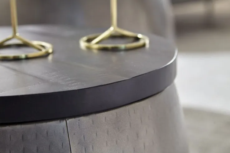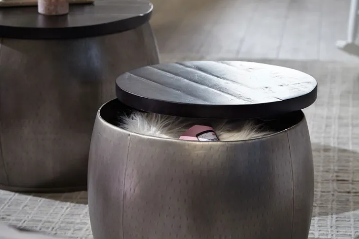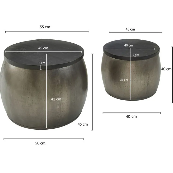 Das 17 kg schwere Couchtisch rund 2er Set Silberfarbig/ Schwarz besteht aus Beistelltischen mit je 55 und 45 cm Durchmesser. Der größere Tisch ist 45 cm hoch, der kleinere 40 cm. Das Besondere: Die silbrigen Sockel beider Setartikel können als Stauräume für Wohnutensilien dienen. In schmuckvoller Fässchen-Optik gliedern sie sich in moderne Wohnräume ein.