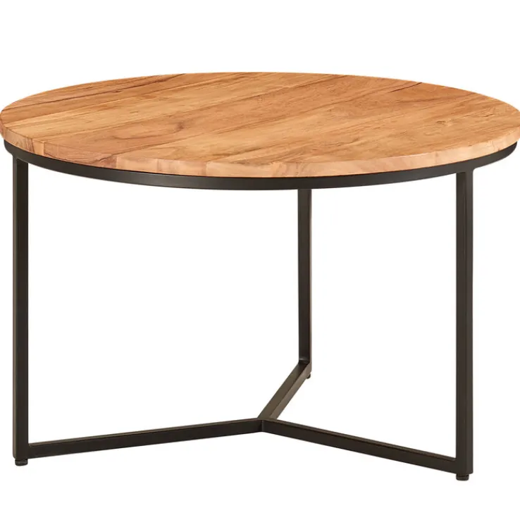 Der runde Couchtisch ist ein zeitloses und dennoch modernes Exemplar aus massivem Holz in der Ausführung Akazie und mit einem Gestell in Schwarz. Er hat einen Durchmesser von 60 cm und ein Dreifußgestell, bei welchem die Füße für einen stabilen, sicheren Stand des Tischs miteinander verbunden sind.