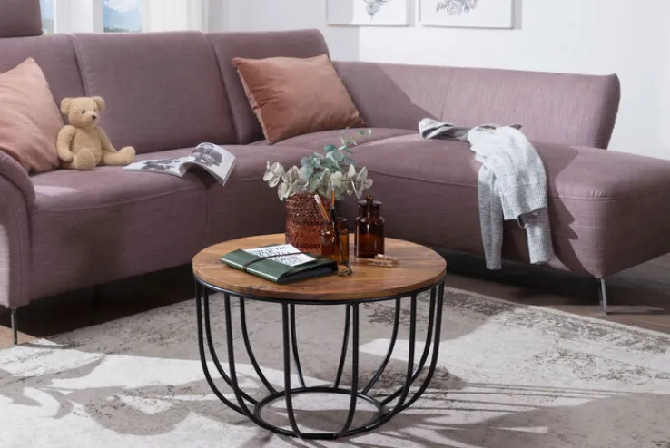 Der runde Couchtisch besitzt eine Größe von 60 x 39 cm und weist ein schwarzes Metallgestell sowie ein Tischplatte Massivholz auf. Er versprüht einen edlen, eleganten Charme im modernen industriellen Stil, der durch die das Holz Räume dennoch mit viel Wärme füllt.