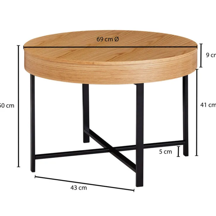 Dieser runde Couchtisch mit den Maßen 69 x 50 cm beeindruckt durch seine zeitlose Eleganz. Das in Schwarz gehaltene Gestell des Tisches harmoniert farblich perfekt mit der Oberfläche in Holzoptik und sorgt durch seine Beschaffenheit für einen stabilen Stand.