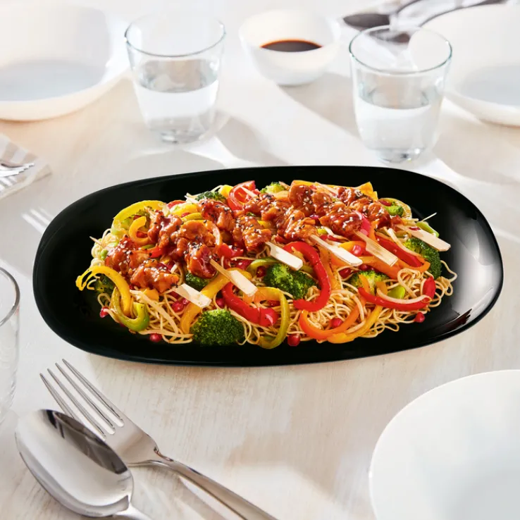 Der schwarze Grillteller ist Teil der Serie ITALIEN PARTY. Er ist aus Glas und rechteckig. Auf der Tellerlänge von 34 cm lassen sich Grillspeisen und Fingerfood gut anrichten. Der Teller ist spülmaschinenfest und mikrowellengeeignet. Gut stapeln lässt er sich auch. Damit bringt das Geschirr ausgezeichnete Voraussetzungen mit für eine unkomplizierte, gesellige Grillparty.