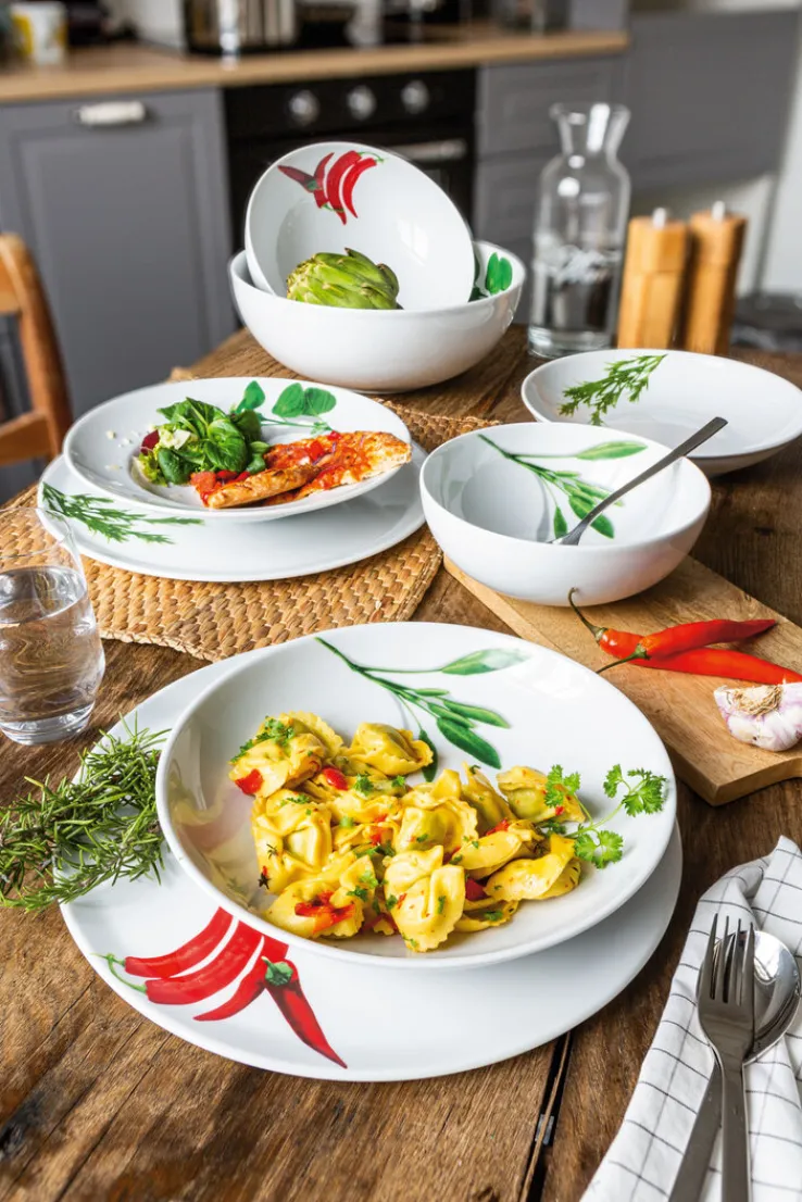 Durch sein ansprechendes Design weckt der CreaTable Pastateller KRÄUTER ROSMARIN den Appetit. Die Vertiefung und der breite Rand machen ihn ideal zum Servieren von Spaghetti und anderen Pastagerichten. Auch Gnocchi lassen sich auf dem Porzellanteller anrichten. Oder Sie verwenden ihn, um Suppen und Salate zu servieren. Ob zur Vor- oder zur Hauptspeise, der Pastateller KRÄUTER ROSMARIN bringt immer einen Hauch moderner Frische in Ihre Tischdeko. Für einen stimmungsvoll gedeckten Tisch lässt er sich optimal mit weiteren Tellern aus dem Hause CreaTable kombinieren.