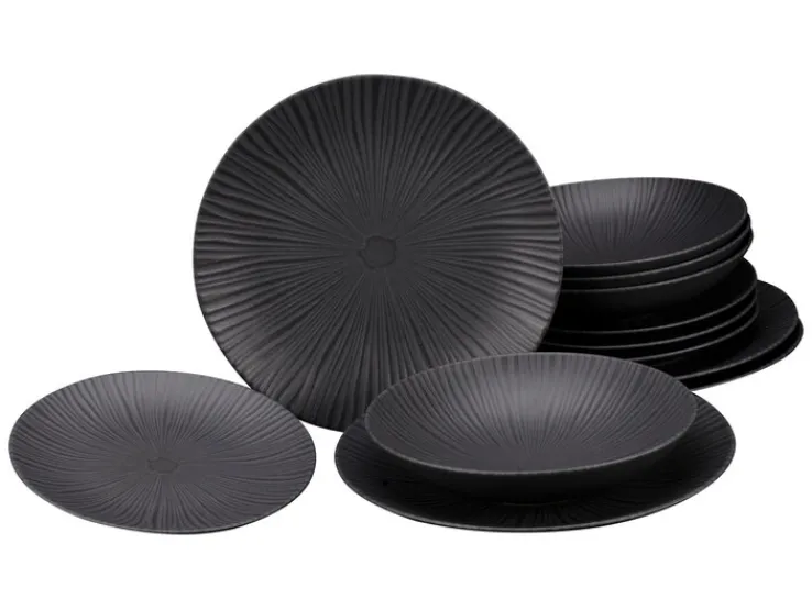 Das exquisite Service VESUVIO beeindruckt mit einem plastisch wirkenden Dekor in Schwarz, das durch seine Zentriertheit an den Kegel eines Vulkans erinnert. Trotz seiner charakteristischen Gestaltung lässt es die Speisen hervorragend zur Geltung kommen. Das adrette casaNOVA Tafelservice VESUVIO besteht aus 4 Suppentellern, 4 Speisetellern und 4 Desserttellern, ist schlagfest, pflegeleicht, mikrowellen- und spülmaschinengeeignet.