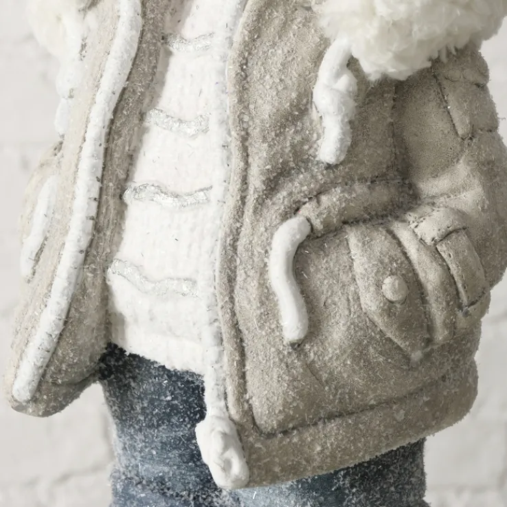 Das Design der Figur zeigt ein lächelndes Kind, das in einem dicken, flauschigen Hut und einer warmen Jacke gekleidet ist, was perfekt die winterliche Atmosphäre einfängt. Die detaillierte Gestaltung der Kleidung, einschließlich der gestrickten Muster auf dem Pullover, verleiht der Figur eine realistische und einladende Optik. Diese Dekofigur ist ideal, um eine gemütliche und festliche Stimmung in Ihrem Zuhause zu schaffen und eignet sich hervorragend als Teil Ihrer Weihnachtsdekoration.