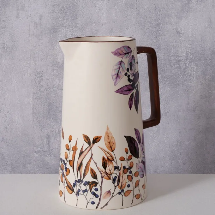 Der handgearbeitete Deko-Krug BRINJA passt durch sein tolles Design in modern eingerichtete Wohnbereiche. Auch für Wohnräume oder Küchen im Landhausstil ist der etwa 27 cm hohe Krug ideal. Durch das florale Muster in verschiedenen Farben ist der formschöne Krug ein Blickfang auf Sideboards oder Kommoden. Auch auf einer Fensterbank oder einem Kaminsims kommt er optimal zur Geltung und ist vielseitig kombinierbar. Der Deko-Krug schafft eine wohnliche Atmosphäre.