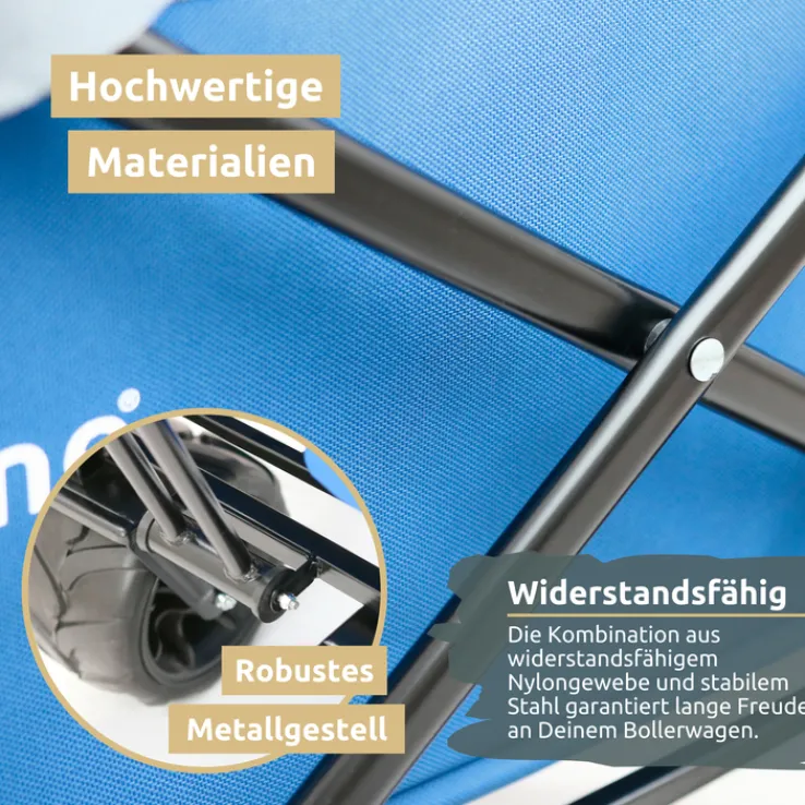 Der Rahmen und das Gestänge des Bollerwagens BENNY ist aus Stahl gefertigt und lackiert. Die Verkleidung und die Schutzhülle des Bollerwagens besteht aus UV- und wetterbeständigem 600D Oxford Nylongewebe.