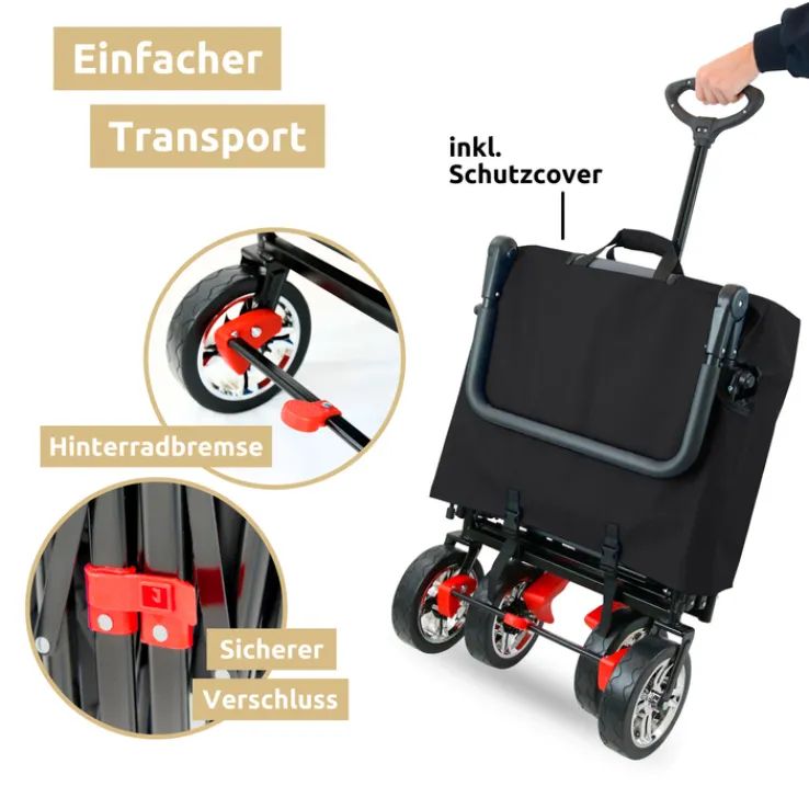 Der schwarz- und graufarbige Bollerwagen BENJI von deluxe4home hat die Maße 56 x 128 cm und präsentiert sich modern und funktionell. Der klappbare Wagen mit verstellbarem Griff ist mit einem abnehmbaren Dach, Getränkehalter und einem Klappfach ausgestattet. Zwei Räder des Wagens sind um 360° drehbar. Für einen sicheren Halt sorgen zwei Feststellbremsen. Der vielseitige Bollerwagen eignet sich für den Alltag, auf Reisen oder für Ausflüge.