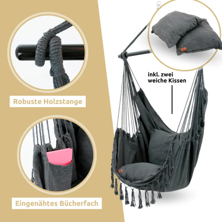 Beim anthrazitfarbigen Hängesessel BOHO von deluxe4home ist der Name Programm. Das 4-teilige Set mit Getränkehalter, Kuscheldecke, Aufbewahrungstasche und Sitz- und Rückenkissen ist im angesagten Boho-Stil gestaltet. Weiche Polster sorgen für eine angenehme Sitzposition. Im Garten oder auf der Terrasse ist der Hängesessel schnell der neue Lieblingsplatz. Der Hängesessel mit einer 360° drehbaren Hakenaufhängung ist vielseitig kombinierbar und lädt zum Entspannen und Relaxen ein.