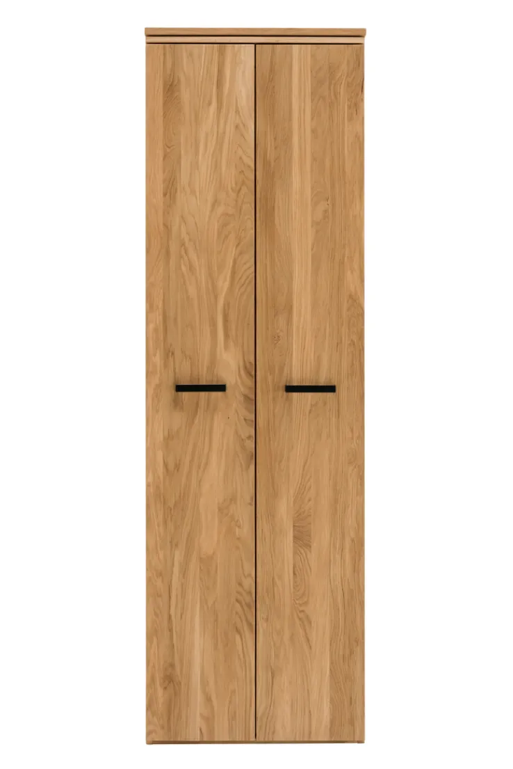 Der Garderobenschrank der Serie LIDO vereint Funktionalität und ansprechendes Design im Landhausstil. Mit einer Breite von 60 cm, einer Höhe von 195 cm und einer Tiefe von 39 cm bietet er ausreichend Stauraum für Ihre Garderobe. Der Schrank besteht aus massivem Eichenholz, das geölt ist, und verleiht Ihrem Raum eine natürliche und warme Ausstrahlung. Die zwei Drehtüren sind mit schwarzen Griffen ausgestattet, die einen eleganten Kontrast zum braunen Holzton bilden.