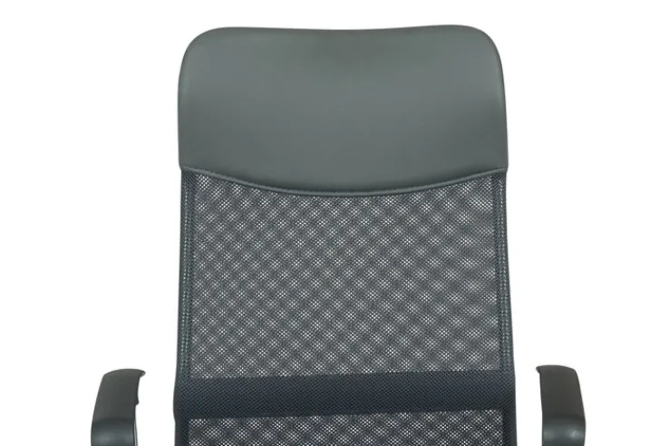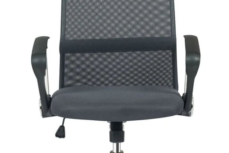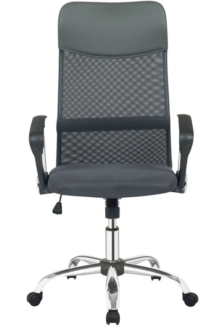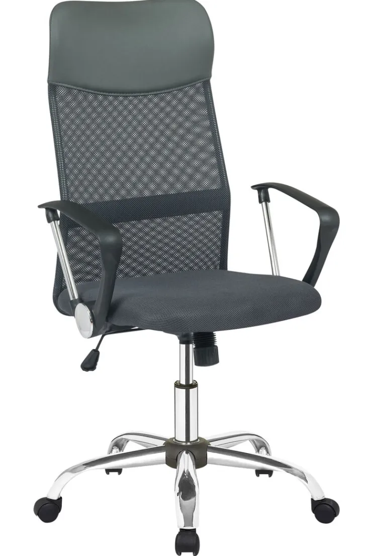 Der Drehstuhl mit Armlehnen kombiniert das chromfarbige Fußgestell aus Metall mit einem bequemen Sitz. Seine gepolsterte Rückenlehne mit Lordosenstütze ist zum Teil mit Netzstoff bespannt, der für eine gute Belüftung sorgt. Die Sitzhöhe des Schreibtischsessels lässt sich von 45 auf maximal 55 cm erhöhen und optimal an den Schreibtisch anpassen. Außerdem bietet der Drehstuhl eine Wippmechanik, womit Rücken und Bandscheiben an einem langen Arbeitstag entlastet werden.