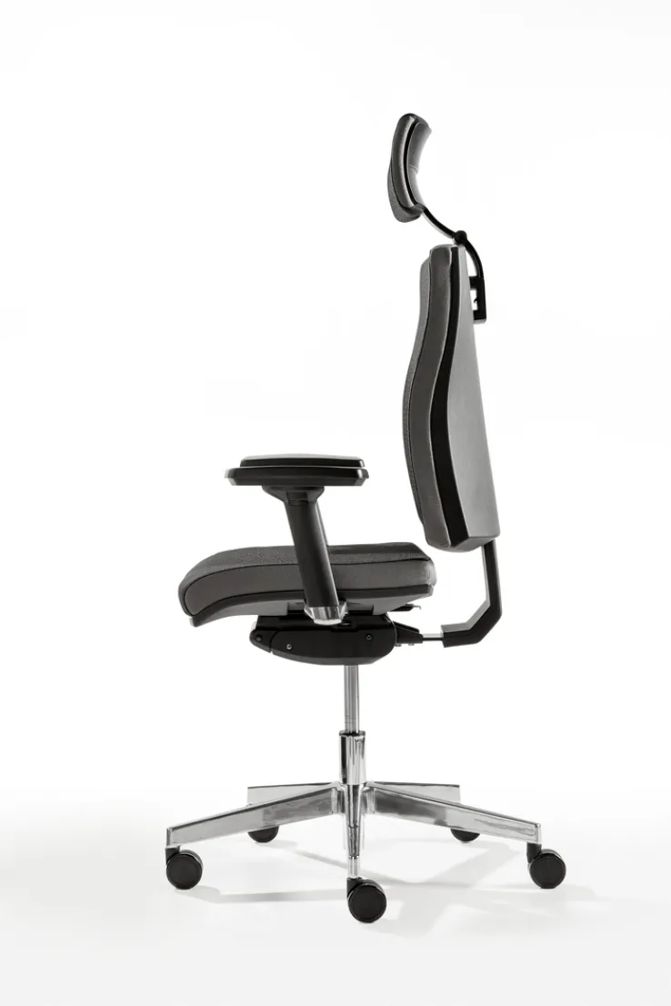 Seine Sitzbreite liegt bei 50 cm, die Sitzhöhe zwischen 42 und 55 cm und die Sitztiefe bei 45 cm. Er ist mit maximal 130 kg belastbar. Dieser bequeme Stuhl ist mit einer Kopfstütze ausgestattet, die den Komfort bei langem Sitzen deutlich erhöht. Die beiden breiten Armlehnen tragen ebenfalls dazu bei. Zudem sorgt das Drehkreuz mit fünf Rollen für Standsicherheit.