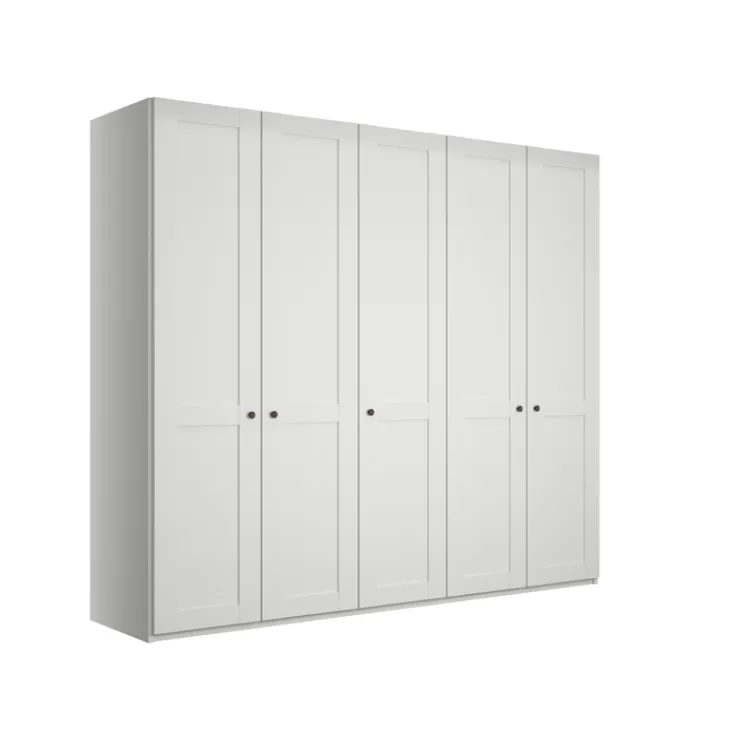 Dieser Kleiderschrank im Landhausstil besteht aus einer weißen Holznachbildung und stellt das visuelle Highlight in jedem Schlafzimmer dar, was auch durch die kontrastreichen Knöpfe zum Öffnen und Schließen unterstützt wird. Er verfügt über eine Breite von 250 cm, eine Höhe von 216 cm sowie eine Tiefe von 58 cm. Ausgestattet ist er mit fünf Drehtüren, hinter denen sich ausreichend Stauraum für die Garderobe und weitere Dinge befindet, sodass er die Ordnung nicht nur im Schlafzimmer, sondern ebenso im Schrank selbst unterstützt.
