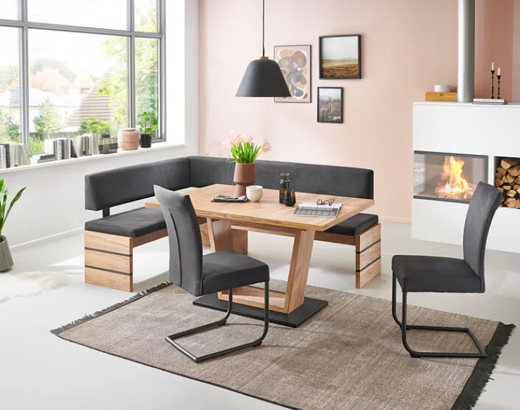 Wer auf der Suche nach Möbeln für ein Gartenhaus ist, trifft mit der Eckbank ebenfalls eine hervoragende Wahl. Der lange Schenkel der Eckbank befindet sich auf der rechten Seite. Auf einem Wangengestell sind die Sitzfläche und Rückenlehne fixiert. Dieses ist mit einer Struktureiche-Optik versehen und ausgesprochen modern.