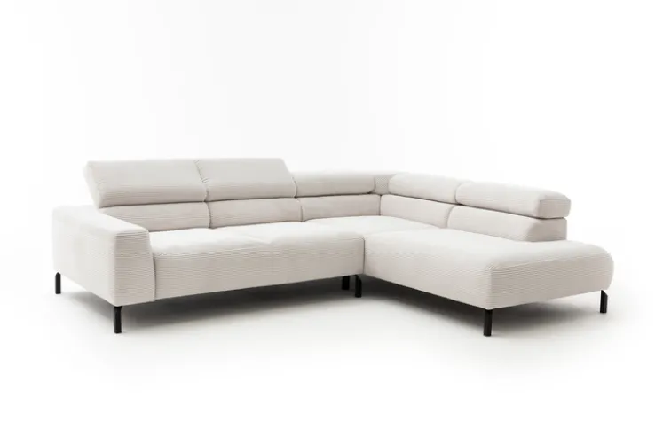 Das stilvolle Ecksofa SPRING passt besonders gut zu einem modernen Einrichtungsstil und in ein gehobenes Wohnambiente. Der weiche Cord-Bezug besteht aus Polyester und Polyacryl. Da der Rücken des Ecksofas echt bezogen ist, lässt es sich frei im Raum aufstellen. Die schwarzen Füße aus Metall geben dem Sofa festen Stand, wirken optisch aber filigran. Dank der Polsterung und der breiten Armlehnen ist es sehr bequem. Für noch mehr Sitzkomfort sorgt die Kopfteilverstellung.