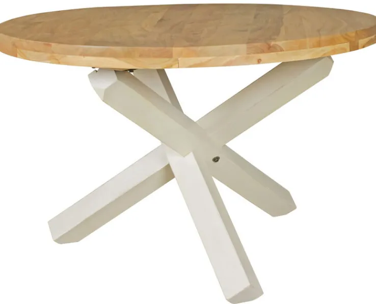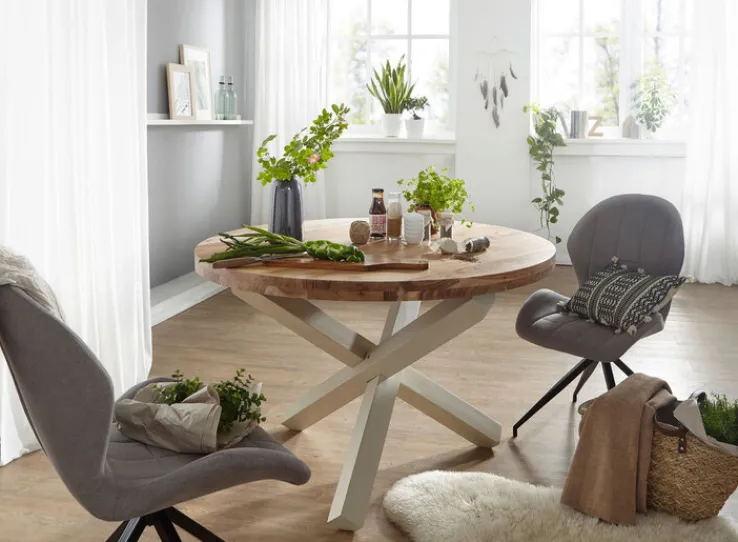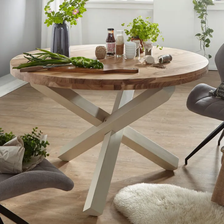 Der runde Esstisch hat einen Durchmesser von 120 cm und wertet den modern eingerichteten Wohn- oder Essbereich auf. Durch die fein gemaserte Tischplatte in der Farbe braun und das Untergestell in weiß, ist der Tisch ein vielseitig kombinierbarer Blickfang. Mit modernen oder klassischen Esszimmerstühlen kombiniert, kommt der Tisch gut zur Geltung. Der Esstisch sorgt für eine gemütlicheWohnatmosphäre. Die stabile Tischplatte des Esstischs besteht aus fein gemasertem Akazienholz. Die glatten Oberflächen und Kanten der Tischplatte sind von Hand gebeizt. Das stabile Untergestell ist aus Pinienholz hergestellt. Das Gestell ist mehrfach lackiert. Der Esstisch ist für Räume im Innenbereich geeignet.