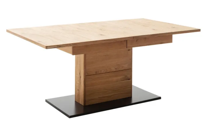 AREZZO verfügt über einen einfach zu bedienenden und sehr robusten Synchronauszug. Der trendstarke und anspruchsvoll verarbeitete Esstisch wurde aufwendig furniert und geölt und hat eine Höhe von 77 cm. Optisches Highlight ist die Bodenplatte in Anthrazit Dunkel, die zu dem warmen Holzton einen interessanten Kontrast bildet. Das Säulengestell trägt auch in einer größeren Runde zu einer optimalen Beinfreiheit bei.
