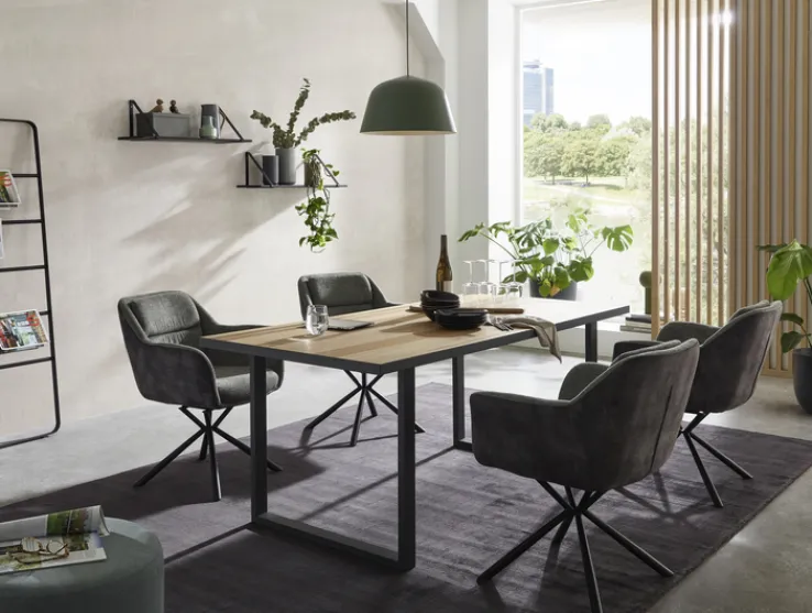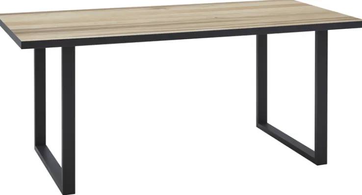 Der Esstisch besticht durch sein modernes Design und die Kombination aus hochwertigen Materialien. Die Tischplatte aus furniertem Eichenholz verleiht dem Tisch eine natürliche und elegante Optik. Die Oberfläche ist pulverbeschichtet, was für eine langlebige und pflegeleichte Nutzung sorgt. Mit einer Breite von 180 cm, einer Höhe von 75 cm und einer Länge von 90 cm bietet der Tisch ausreichend Platz für gesellige Runden und gemeinsame Mahlzeiten.