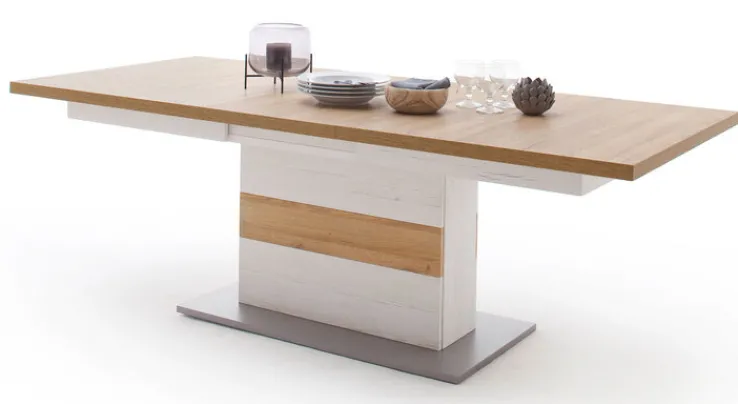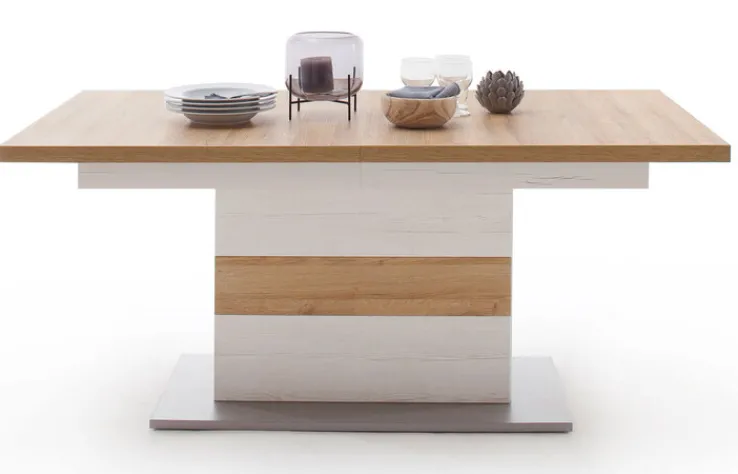 Der Esstisch der Serie CALVA vereint Funktionalität und modernes Design. Mit einer Breite von 100 cm, einer Höhe von 77 cm und einer Länge von 180 cm bietet er ausreichend Platz für gesellige Runden. Bei Bedarf lässt sich der Tisch auf eine maximale Länge von 280 cm erweitern, dank des praktischen Synchronauszugs. Die Hauptfarbe des Tisches ist Braun, ergänzt durch silberfarbene und weiße Akzente, die dem Tisch ein elegantes Erscheinungsbild verleihen. Der Farbton Pinie Aurelio harmoniert perfekt mit den weißen und aluminiumfarbenen Elementen.