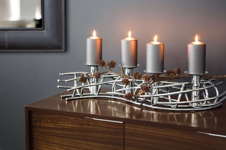 Mit seiner geschwungenen Form ist er insgesamt 80 cm lang und strahlt mit seinen silberfarbig vernickelten Oberflächen nüchterne Eleganz aus. Der Kerzenhalter kann aber längst nicht nur in der Weihnachtszeit Verwendung finden. Da die interessant aus dünnen Metallstäben zusammengesetzte Form keinen spezifischen Weihnachts- oder Winterbezug hat, kann der Kerzenhalter durchaus ganzjährig genutzt und durch verschiedene Arten von Dekoration ergänzt werden.