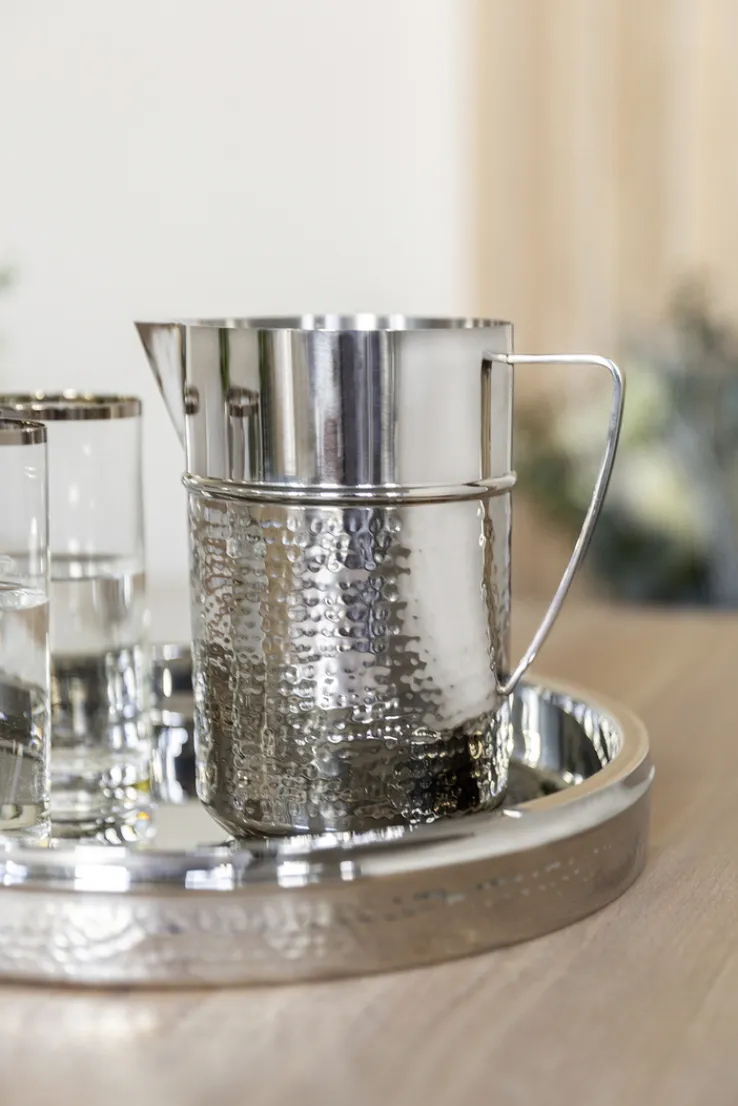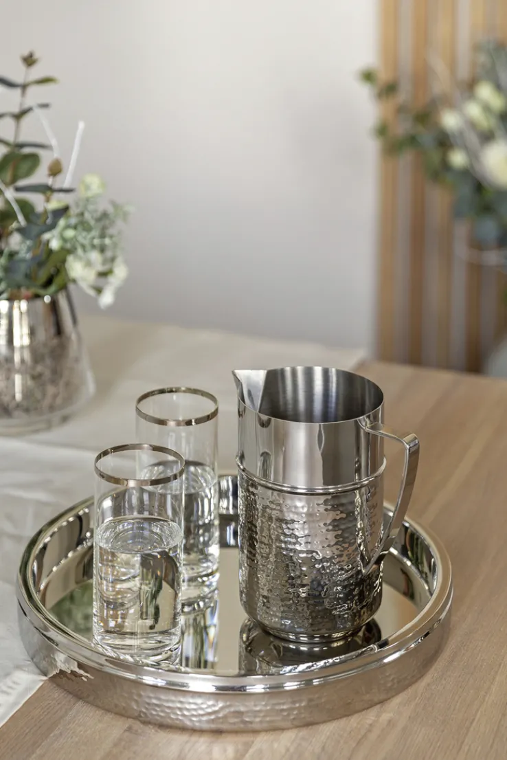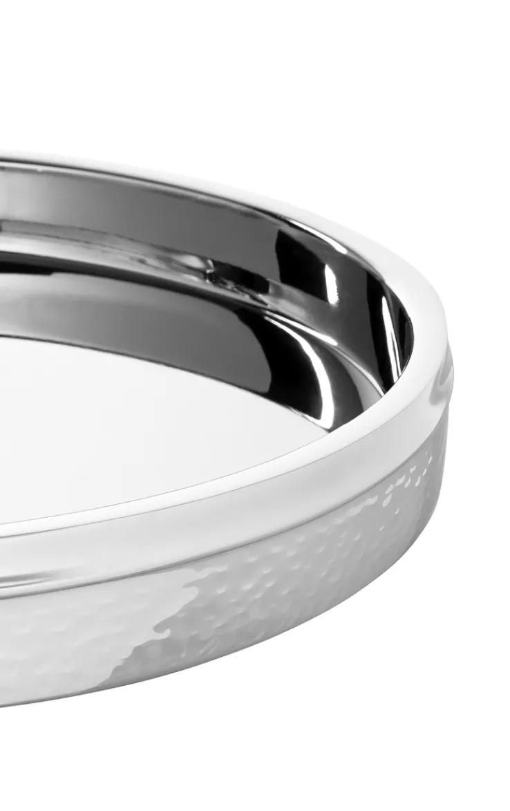 Das silberfarbige Tablett NASSAU von Fink ist aufgrund seiner gehämmerten Oberfläche aus Edelstahl ein echter Hingucker – und zugleich noch unglaublich praktisch. Mit einem Durchmesser von 32 cm bietet das Tablett genügend Platz um für eine bis zwei Personen Speisen, Getränke und Snacks stillvoll zu präsentieren.
