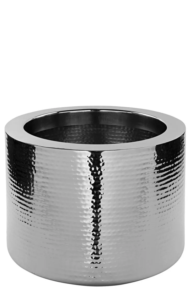 Er zeichnet sich durch seine gehämmerte Optik und das Material Edelstahl aus. Werden im gleichen Raum Kerzen angezündet, spiegelt sich das Licht in der Oberfläche des Übertopfes, was ein stimmungsvolles Ambiente schafft. Wer eine Grünpflanze verschenkt, setzt mit dem Übertopf den passenden Rahmen.