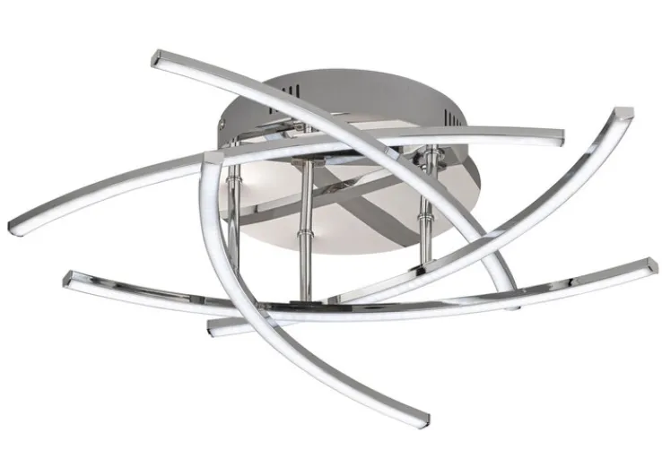 Die FISCHER & HONSEL LED Deckenlampe CROSS besteht aus chromfarbigen Metall und besitzt 5 Lichtquellen. Die Farbe Chrom eignet sich für alle Räume. Weiterhin ist die Deckenleuchte dimmbar und per Fernbedienung zu steuern. Fünf raffiniert angeordnete, ineinandergreifende Arme sorgen für die richtige Beleuchtung. Sie sind lang und schlank und ergeben zusammen fast ein Rund. Ihre zarte Eleganz überzeugt und auch der metallische Baldachin, der an der Decke befestigt wird, passt harmonisch dazu.