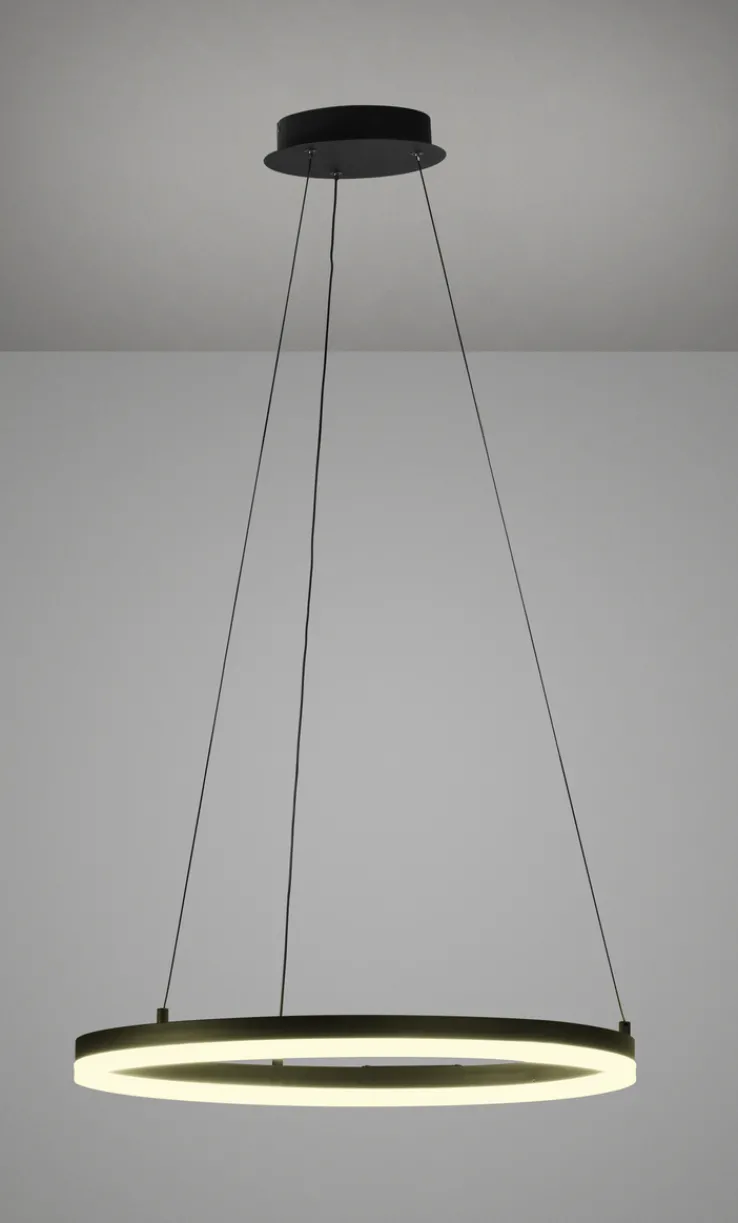 Die FISCHER & HONSEL LED Pendelleuchte SIRKO hat einen Durchmesser von 60 cm und eine einstellbare Höhe von 50 bis 150 cm. Sie ist aus Metall in Sandschwarz und weißem Glas.
