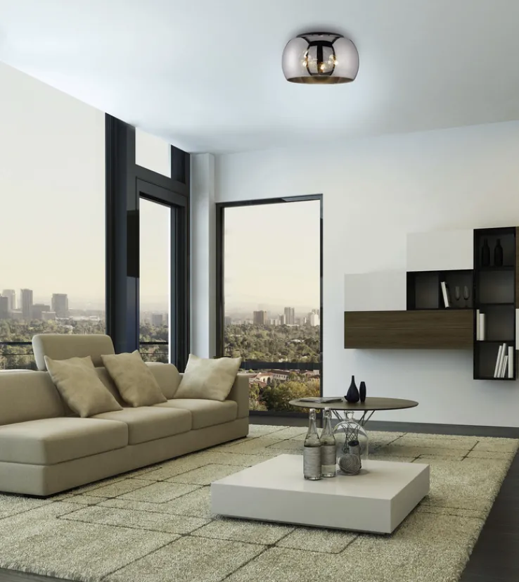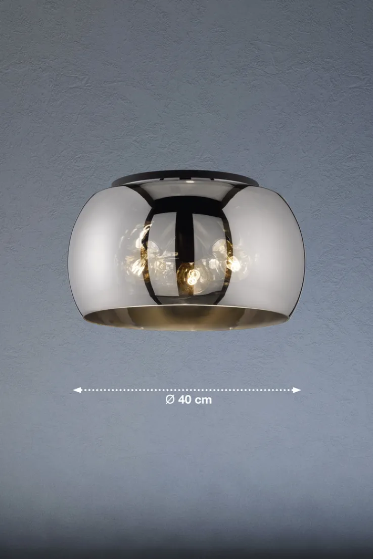 Die FISCHER & HONSEL Retrofit Deckenlampe DIMA ist 40 cm breit und 40 cm tief bei einer Höhe von 22 cm. Sie ist aus Metall in Sandschwarz und rauchfarbigem Glas.