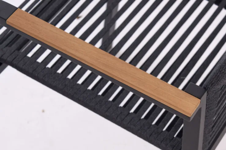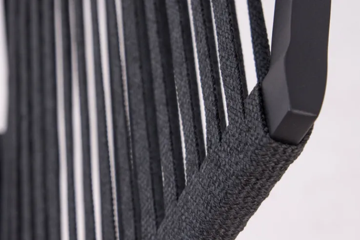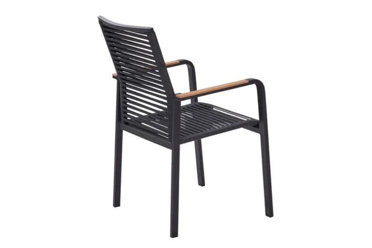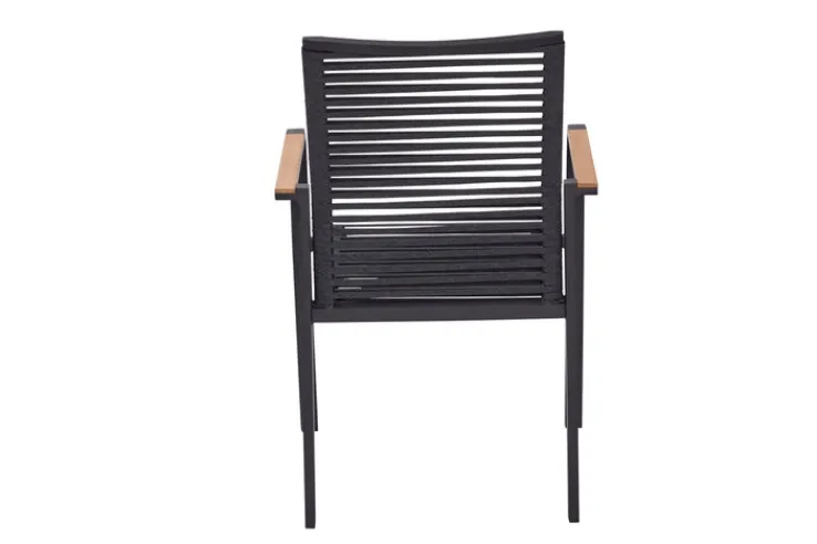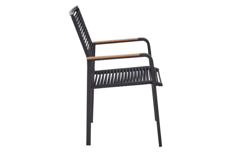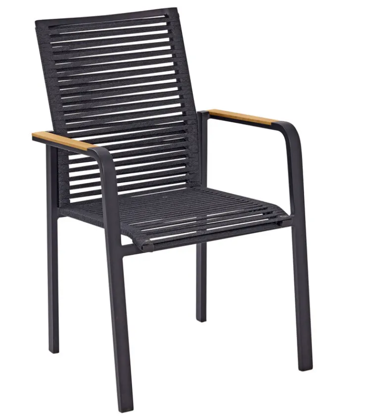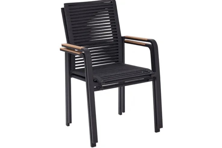 Der Garden FLAIR Stapelstuhl Garten LEIF in Schwarz/Rope ist 89 cm hoch, 56 cm breit und 61 cm tief. Er ist aus schwarzem Aluminium mit Armlehnen aus Holz und einem Geflecht aus Kunstfasern.