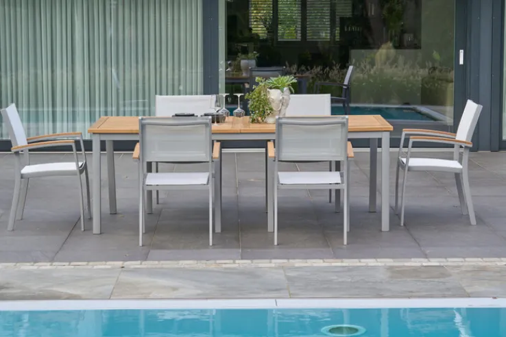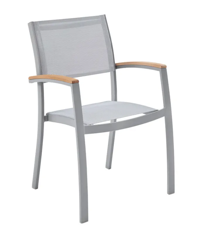 Der Garden FLAIR Stapelstuhl Garten SALZBURG besteht aus Aluminium und einem textilen Outdoorgewebe in hellgrau. Er besitzt zwei Armlehnen und ist äußerst platzsparend, da stapelbar.