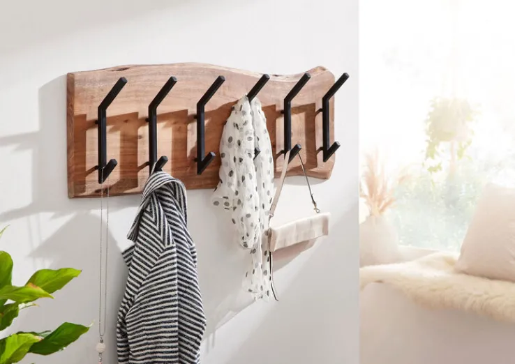 Das massive Garderobenpaneel hat die Maße von 100 × 29 cm und ist die praktische Lösung für modern und klassisch eingerichtete Flure und Dielen. Durch das schön gemaserte Akazienholz kommt das Paneel optimal zur Geltung und ist vielseitig mit verschiedenen Garderobenmöbeln kombinierbar. Sechs Doppelhaken bieten Platz für Jacken, Mäntel, Schals und Taschen. Das Garderobenpaneel trägt zu einer wohnlichen Atmosphäre bei.