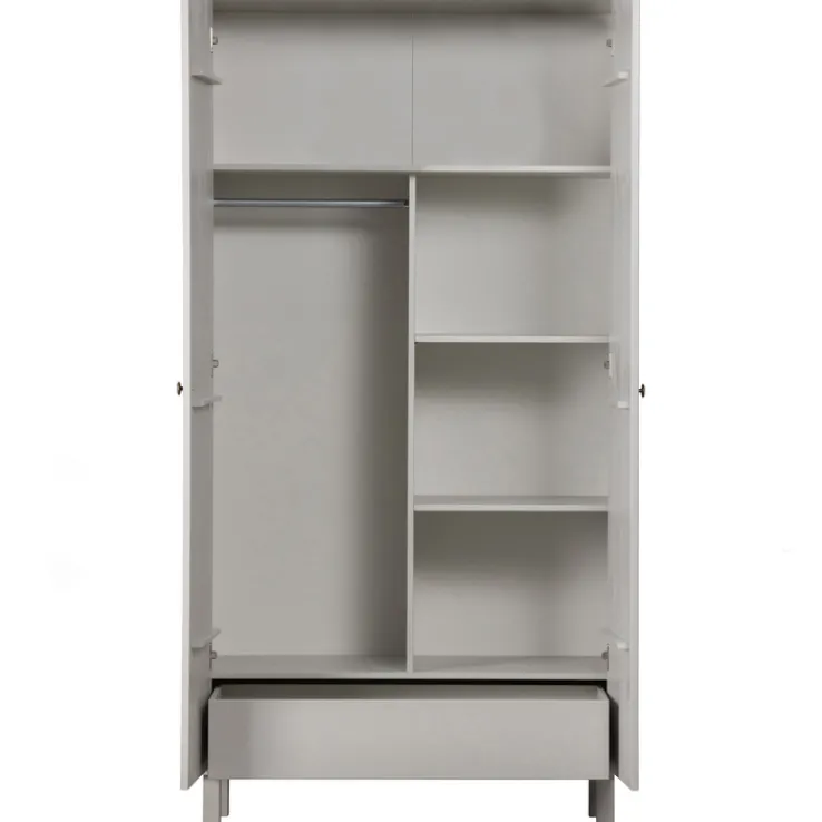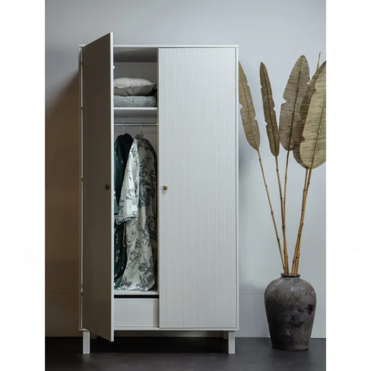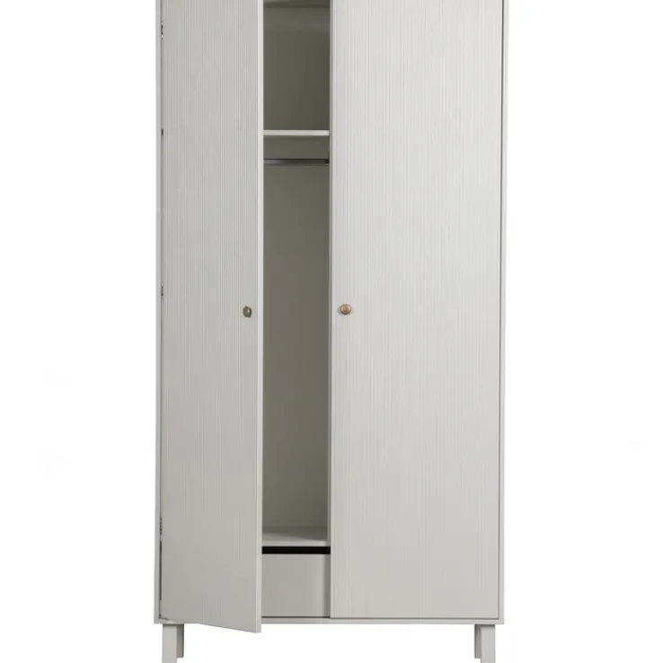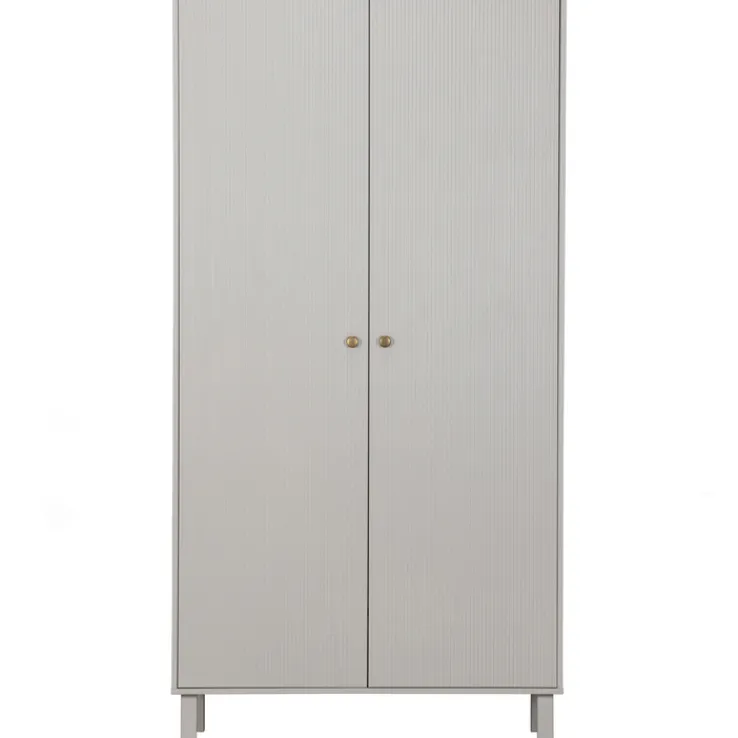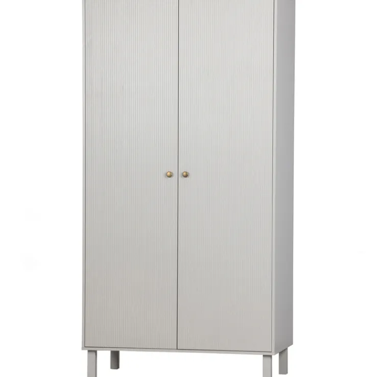 Mit den speziellen, cloud grey lackierten Oberflächen und den goldfarbigen Türknöpfen bringt der Garderobenschrank MADU moderne Eleganz in den Flur. Im Inneren des 100 x 195 cm großen und 53 cm tiefen Dielenmöbels steht zudem viel Stauraum für Kleidung und Accessoires zur Verfügung.