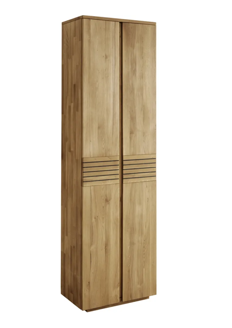Der Garderobenschrank der Serie SORRENT besticht durch sein modernes Design und die Verwendung von massivem Eichenholz. Die naturbelassene, geölte Oberfläche verleiht dem Schrank eine warme, braune Farbe, die sich harmonisch in verschiedene Wohnstile einfügt.