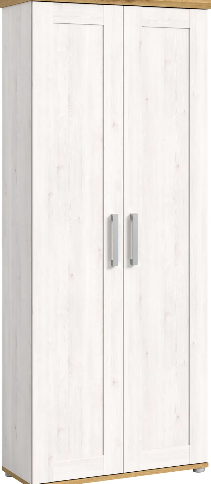 Das praktische Möbelstück präsentiert sich im romantischen Landhausstil und wird so zum Blickfang im Flur. Durch die Farbkombination aus weißer Sibiu Lärche in der Front und braunem Artisan Eiche Holzdekor in der Deckplatte und im Sockel werden wohnliche Akzente gesetzt. Der Garderobenschrank VERONA ist mit zwei Drehtüren ausgestattet, wohinter sich zwei Einlegeböden und eine Kleiderstange befinden. Dadurch bietet er einen großzügigen Stauraum an der Garderobe, um Jacken, Mäntel oder andere Kleidungsstücke und Accessoires ordentlich unterzubringen.