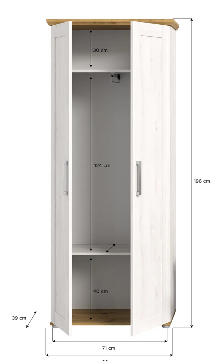 Der Garderobenschrank VERONA ist aus einer Holznachbildung in den Dekorfarben Sibiu Lärche / Artisan Eiche gefertigt. Sein Stellmaß beträgt 78 x 194 x 37 cm (BxHxT).