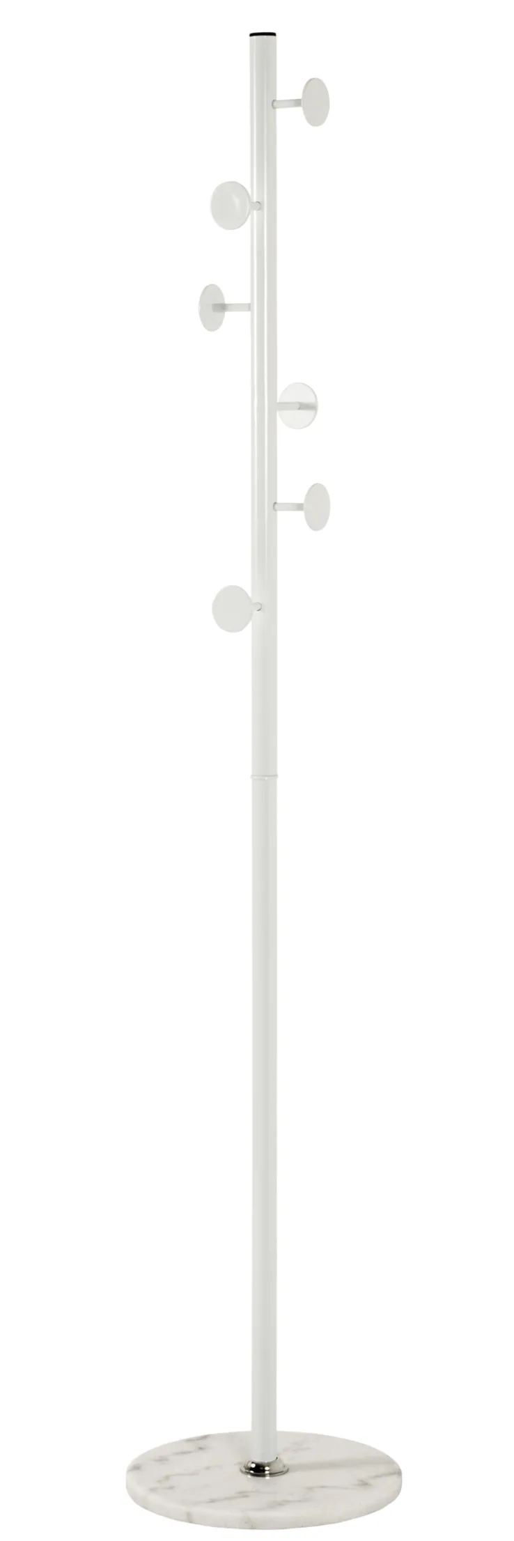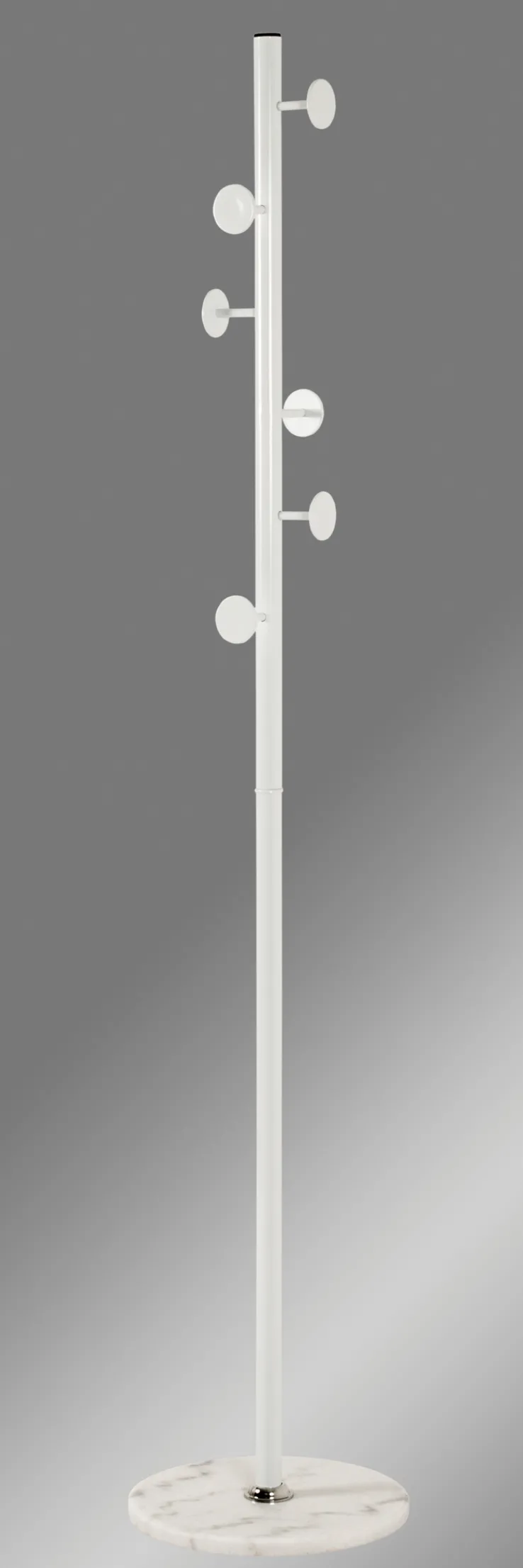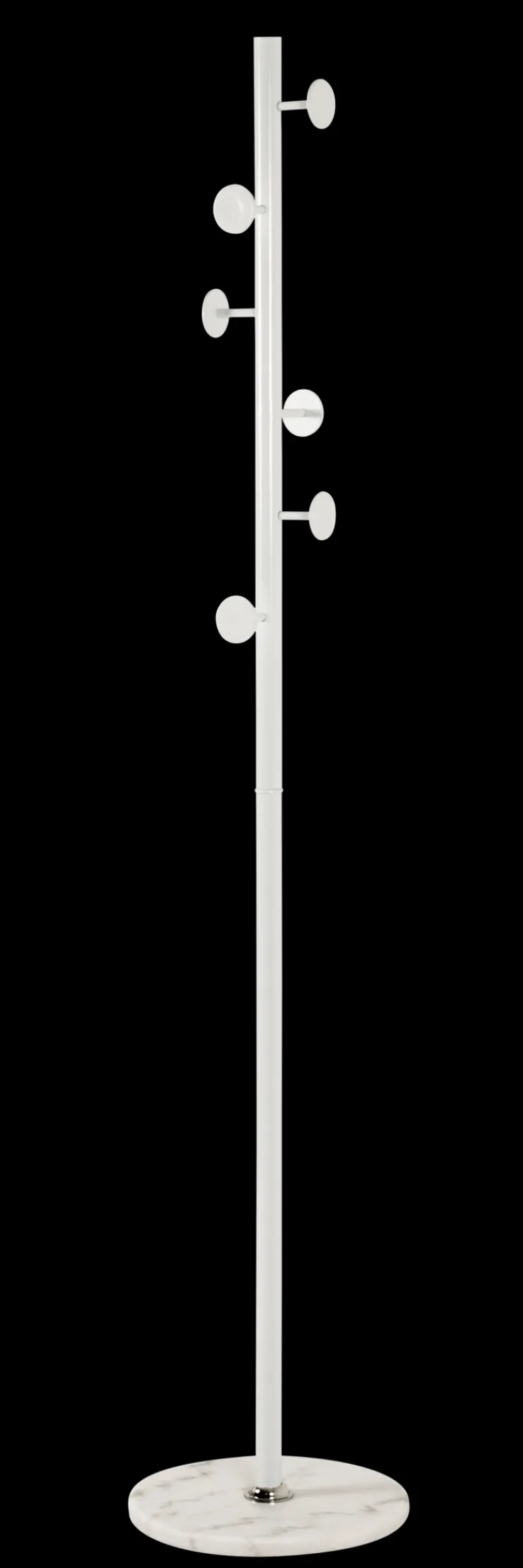 Der minimalistisch designte 35 x 35 cm große weiß-braune Garderobenständer hält sich visuell auf angenehme Weise zurück, bietet mit seinen integrierten sechs Haken aber zugleich viele Möglichkeiten an, um Jacken und Accessoires oder Kopfbedeckungen stilvoll aufzuhängen. Die Kombination aus Marmor-Standfuß und Metallgestell sorgt für das gewisse Etwas und gewährleistet einen sicheren Stand.