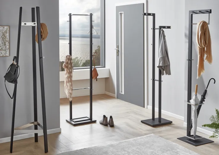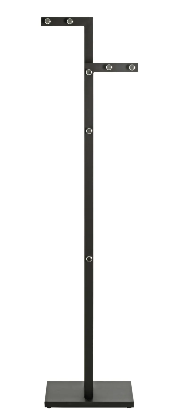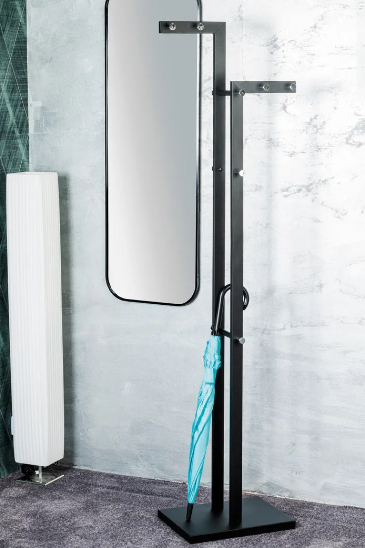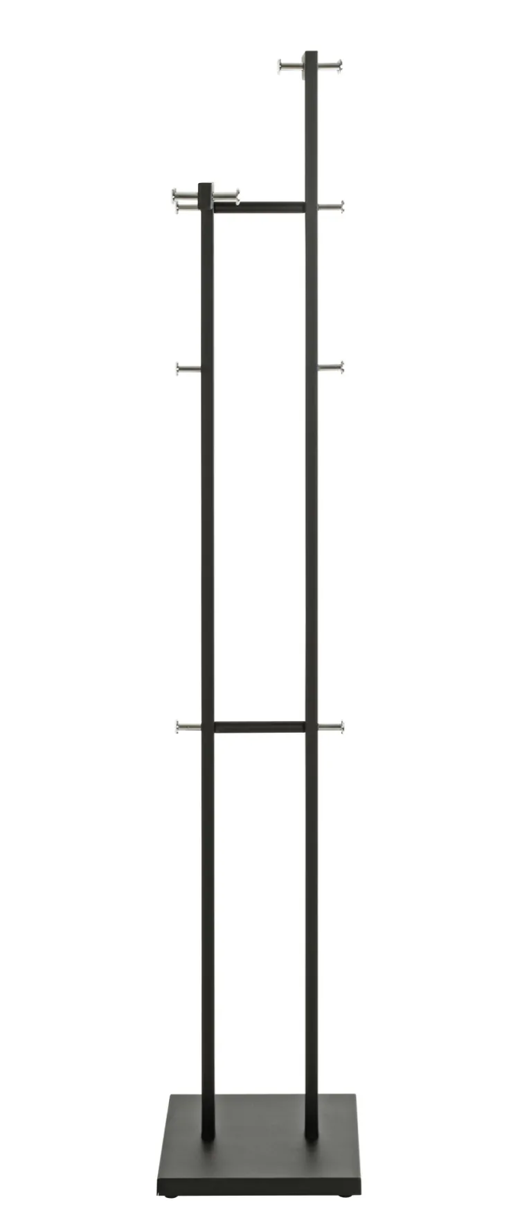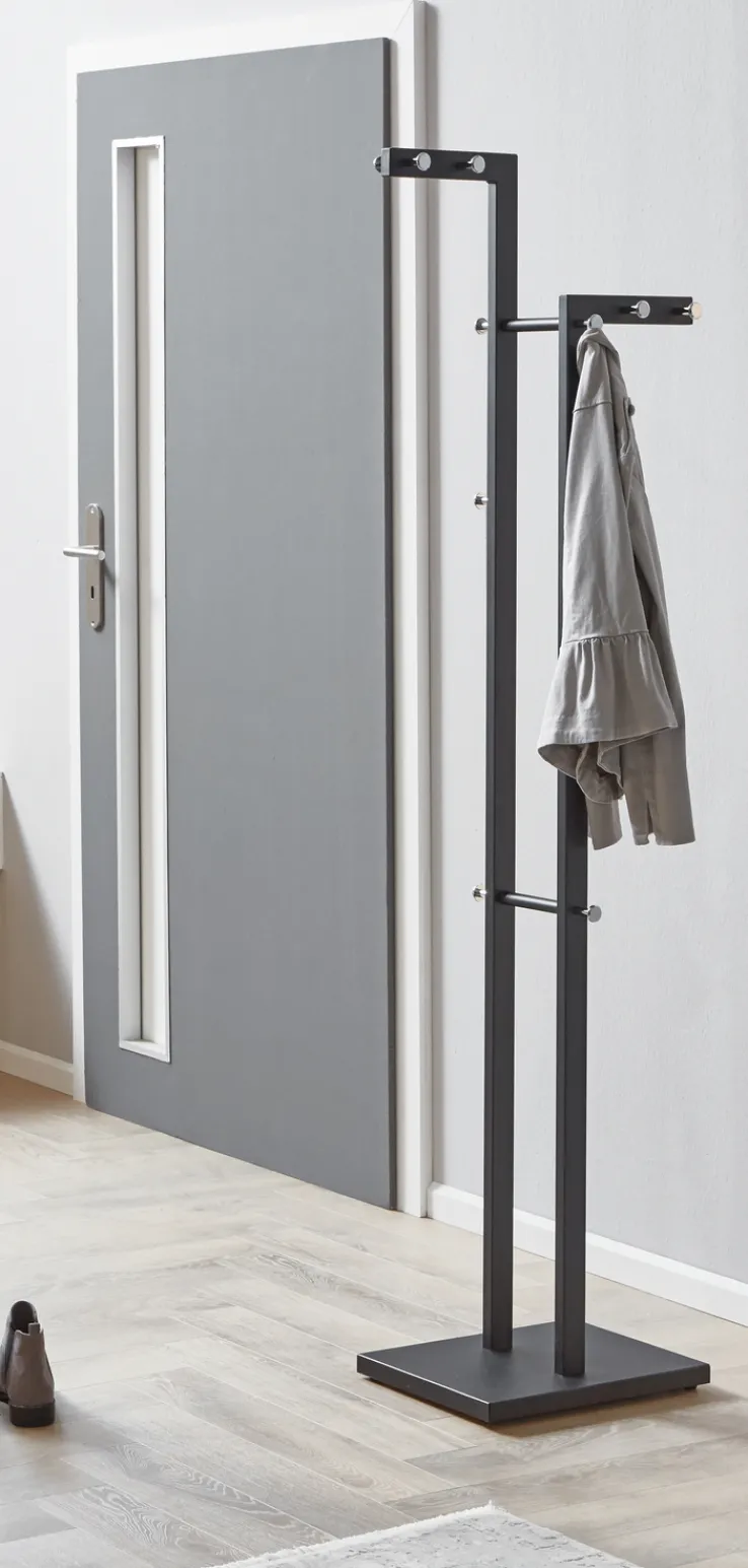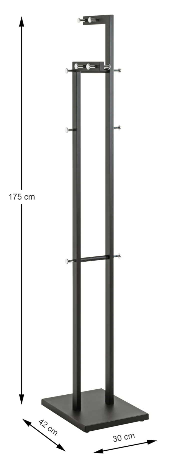 Der schwarze Garderobenständer mit den chromfarbigen Haken sowie Kleiderstangen hat mit den schmalen Maßen von 42 Zentimetern Breite, 175 Zentimetern Höhe und 30 Zentimetern Tiefe in jedem Eingangsbereich und auch im Gästezimmer Platz.