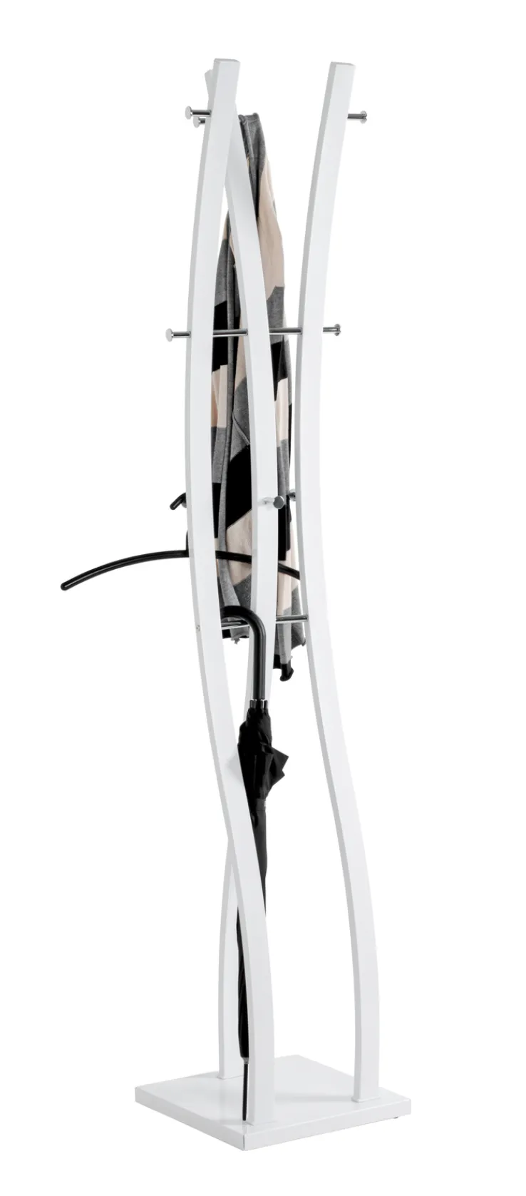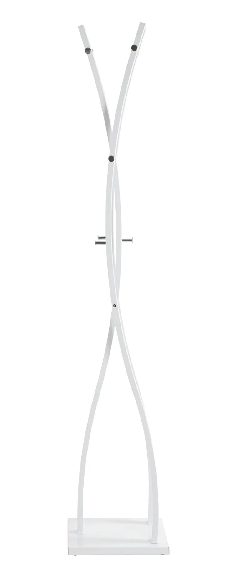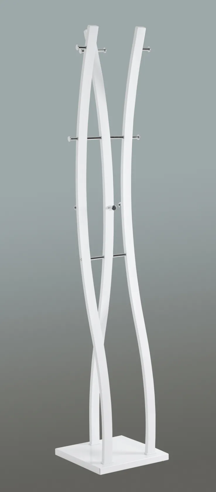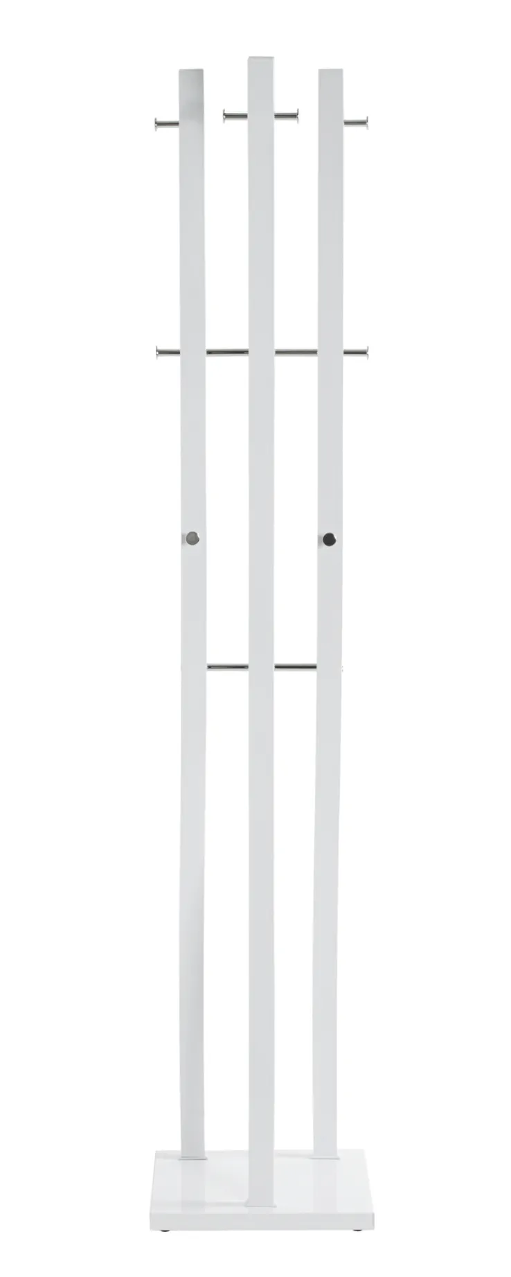 Der anmutige Garderobenständer BENNO ist 35 x 180 x 35 cm groß und aus weißem Chrom gefertigt.